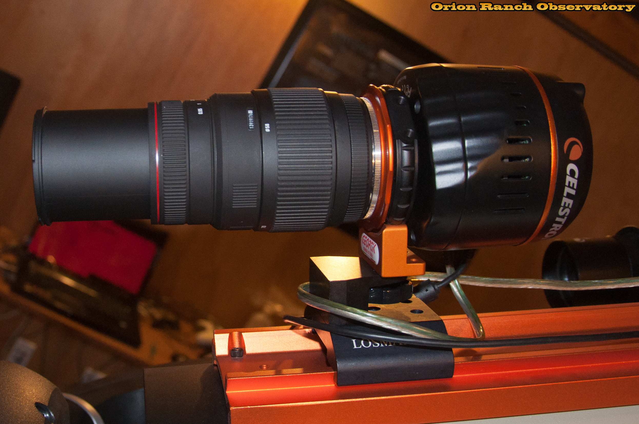 Various views of my Sigma70-300 mm Nikon mount lens and Celestron Nightscape mounted on the adapter with the lens at the 300 mm setting. The nose is getting long, so I better never run past -90 elevation on the fork mount! Unfortunately there's no rotation for the T-ring mount, so the camera ends up at whatever orientation you get.