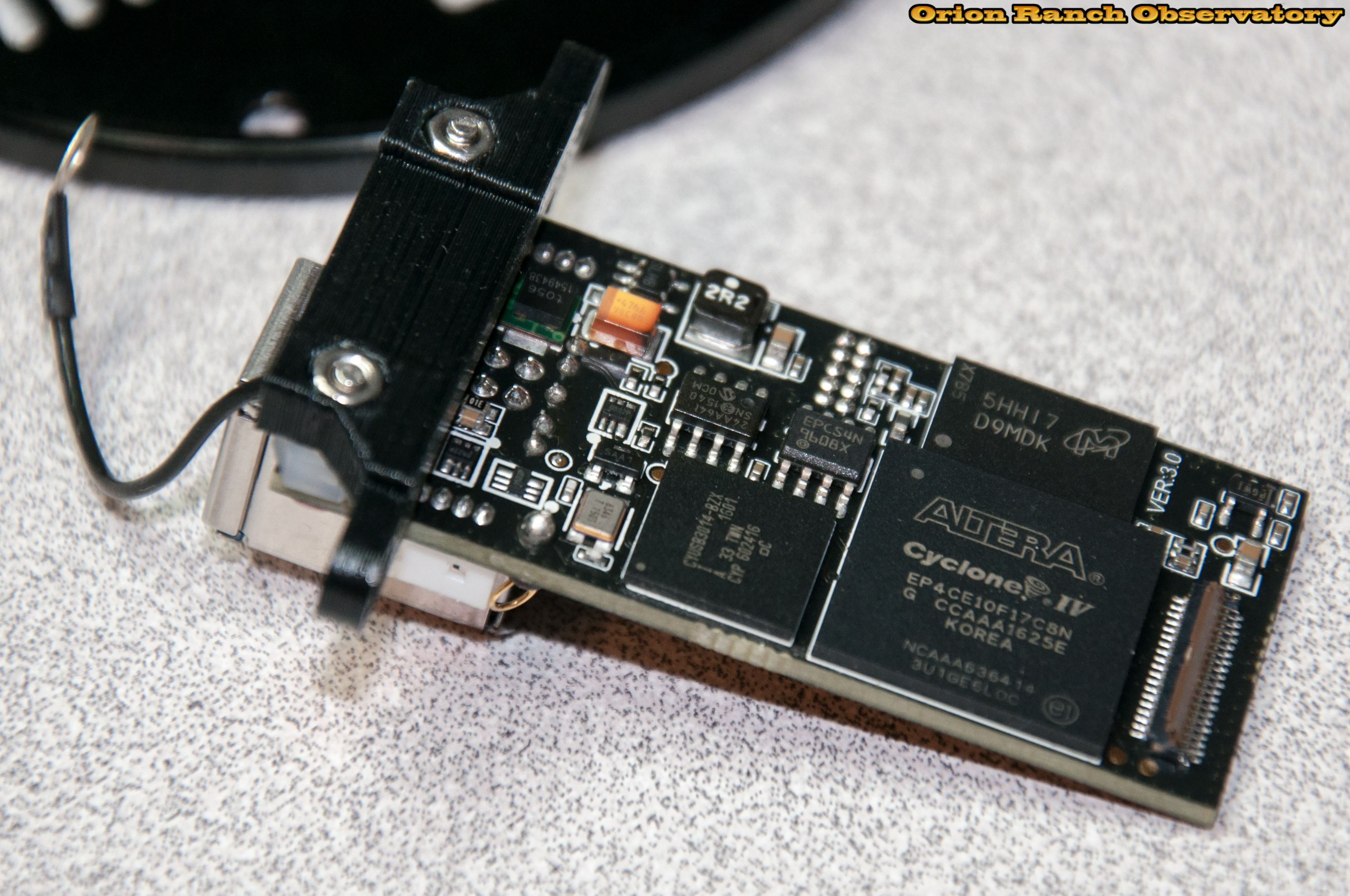 On this top side of the board you can see the large Altera FPGA. To the left is the Cypress Semiconductor USB 3.0 chip, and above is an apparently obsolete Micron Gigabit SDRAM. To the right of the FPGA is a flip style printed ribbon connector. This also has another view of the 3D printed mount.