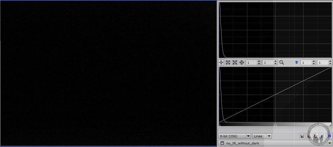 With the IR camera off, the image is near total dark. Without the dark library enabled, the image is black and the histogram is to the left.