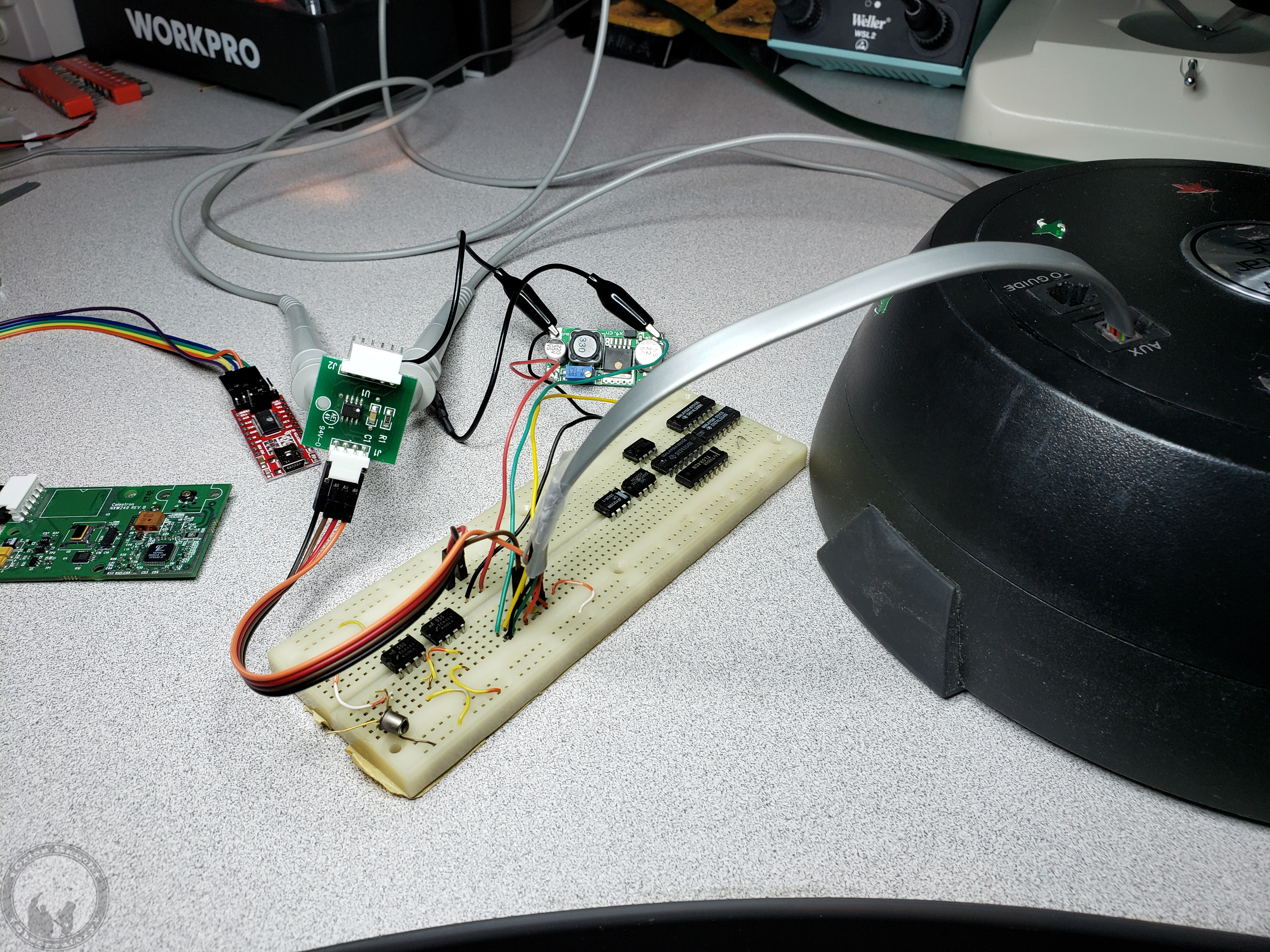 Rather than removing the NexStar GPS from the observatory, I rigged up a voltage regulator so I could plug the NXW434 into my NexStar 8SE mount. Ignore all the other chips stored on the breadboard.