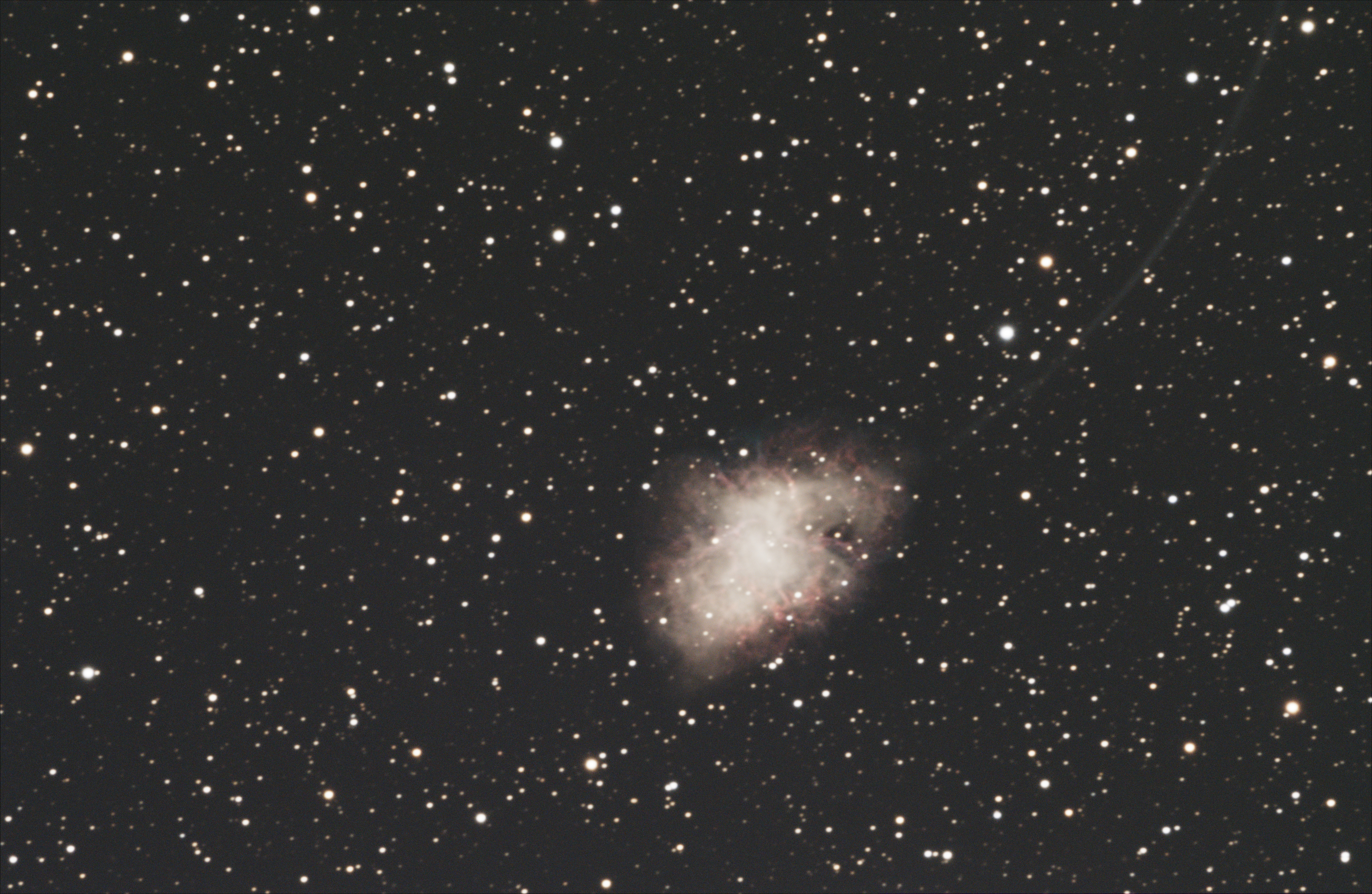 This is a stack of 9 frames of ten-minute exposures with the gain set to about 3/4 of maximum. New darks and bias frames were captured at this setting and the flats taken for the previous low gain setting were all applied and stacked in DSS, and a basic non-linear stretch was performed in Photoshop. The estimated color corrections applied previously in DSS were removed. Click on the photo for the full sized image and then right click to view the image only and zoom (or download with the disk icon) to see the removal of the hot pixels.