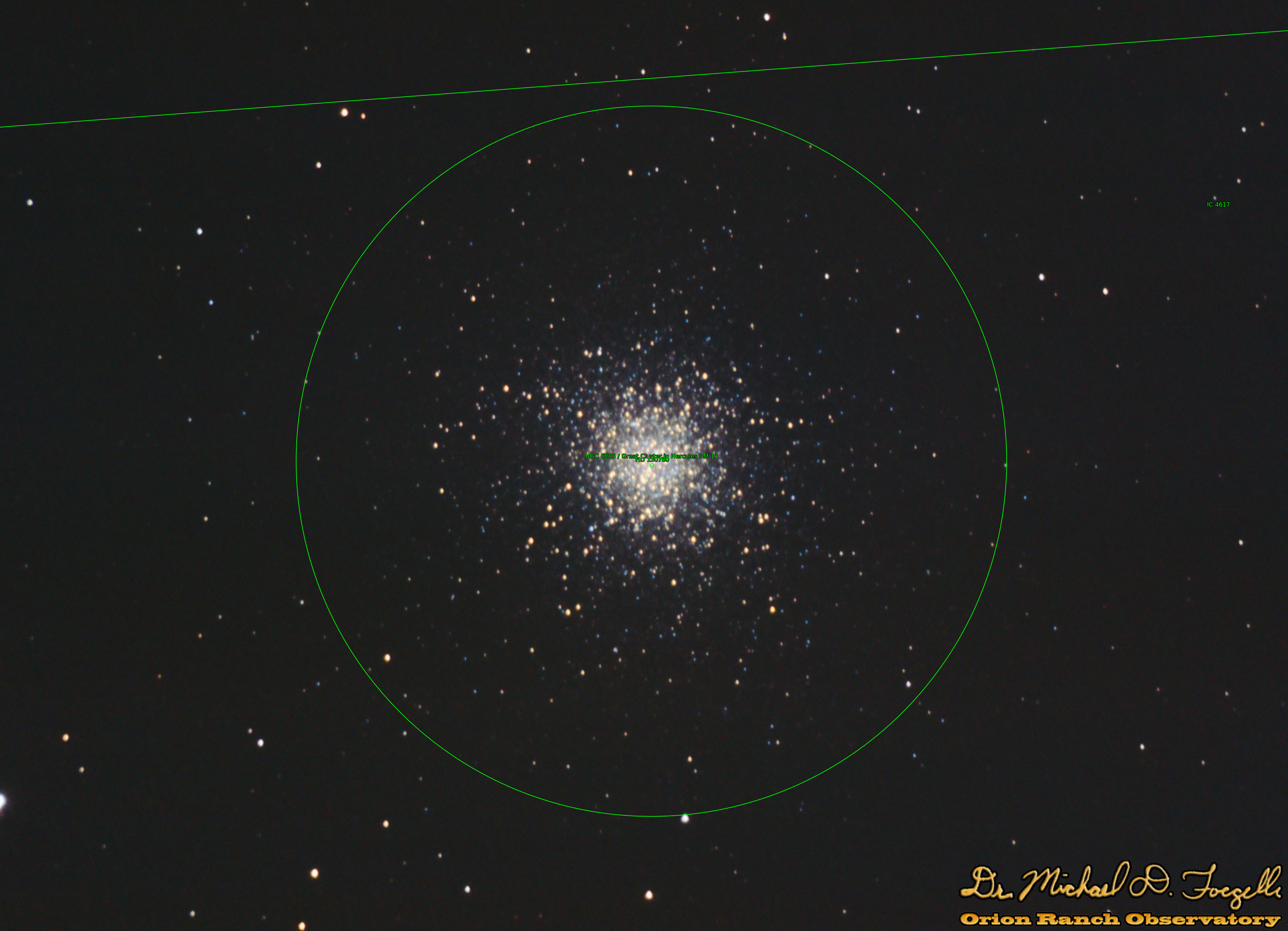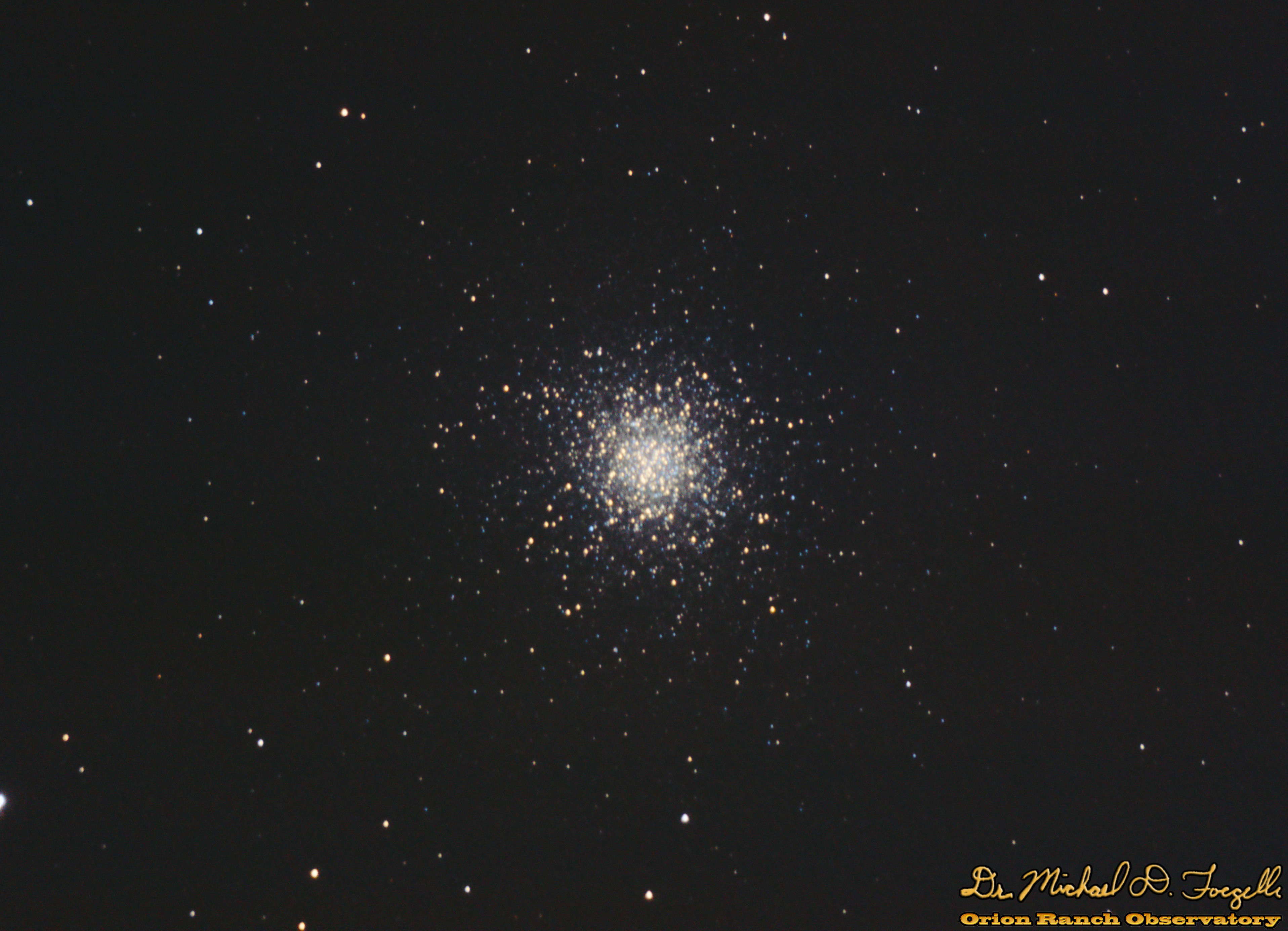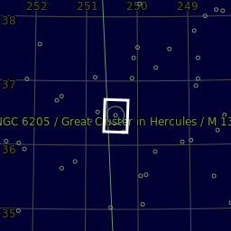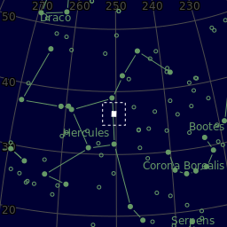 Messier 13 (NGC 6205) is a globular cluster of about 300,000 stars in the constellation of Hercules. Located along one edge of the central keystone of four stars in Hercules, the Hercules cluster is considered the finest globular cluster in the Northern Hemisphere.