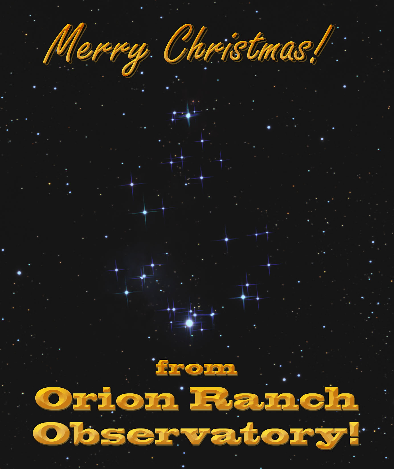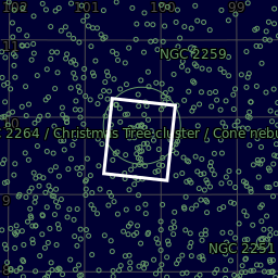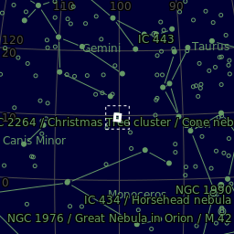 The Christmas Tree Cluster (NGC 2264) is an asterism (group of stars with a noticeable structure resembling other objects) in the constellation of Monoceros (the Unicorn) just off the right arm of Orion, the Hunter. The brightest star in the cluster serves as the trunk with the next brightest as the tree-topper, with the remaining stars in a zig-zag pattern similar to a typical drawing of a Christmas tree. Coincidentally, this cluster is easily visible from the northern hemisphere with a low power telescope or binoculars in the evenings starting around November.