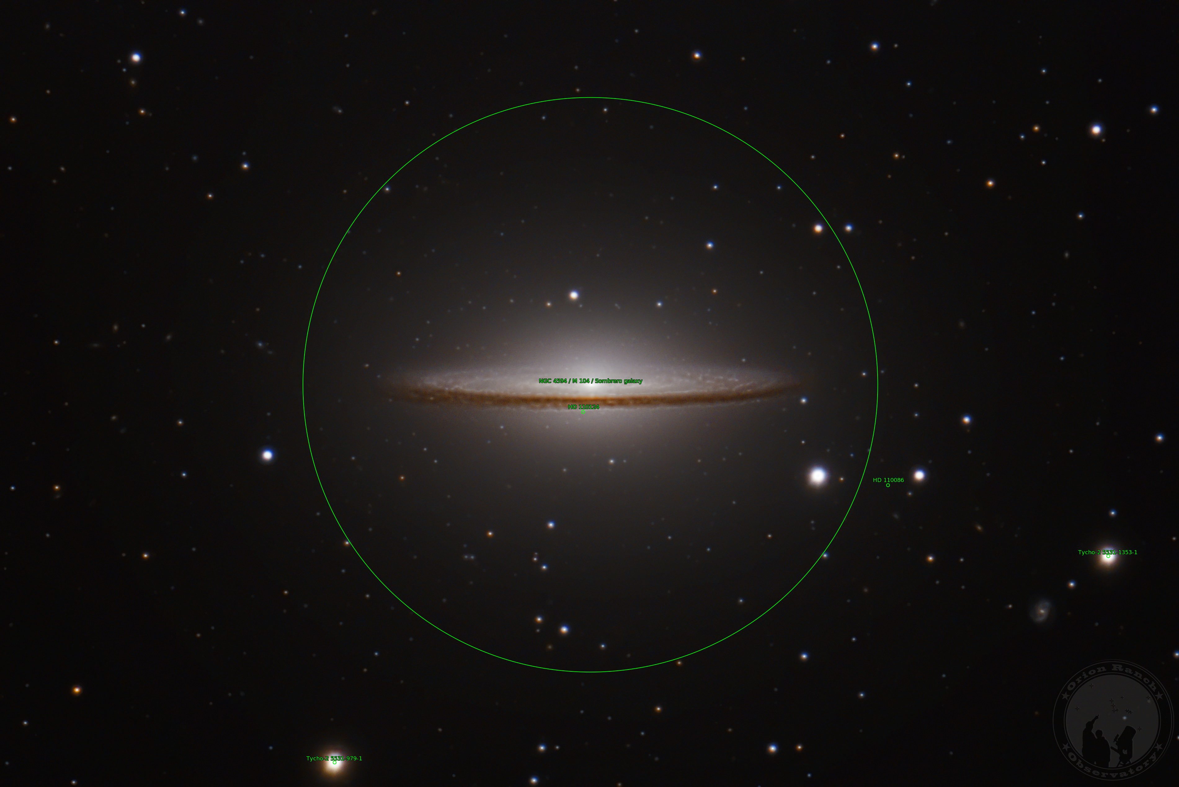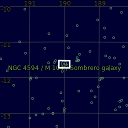 The Sombrero Galaxy (Messier/M104 or NGC 4594) is a spiral galaxy in the constellation Virgo. It has a dark, prominennt dust lane around its inclined disk and a large central bulge giving it the appearance of a sombrero. It is located approximately 31,100,000 light years from Earth and has a diameter of approximately 50,000 light-years, making it 30% of the size of the Milky Way. The galaxy has an apparent magnitude of +8.0, making it easily visible with amateur telescopes in dark skies.