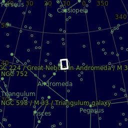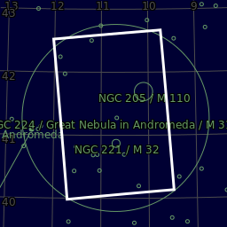 The Andromeda Galaxy (Messier 31) is a spiral galaxy located in the constellation of Andromeda. It's approximately 2.5 million light-years from Earth, making it the nearest major galaxy to the Milky Way, and is approximately 220,000 light years across. Also in the same field of view are Messier objects M32 and M110, both of which are satellite dwarf galaxies orbiting Andromeda.
