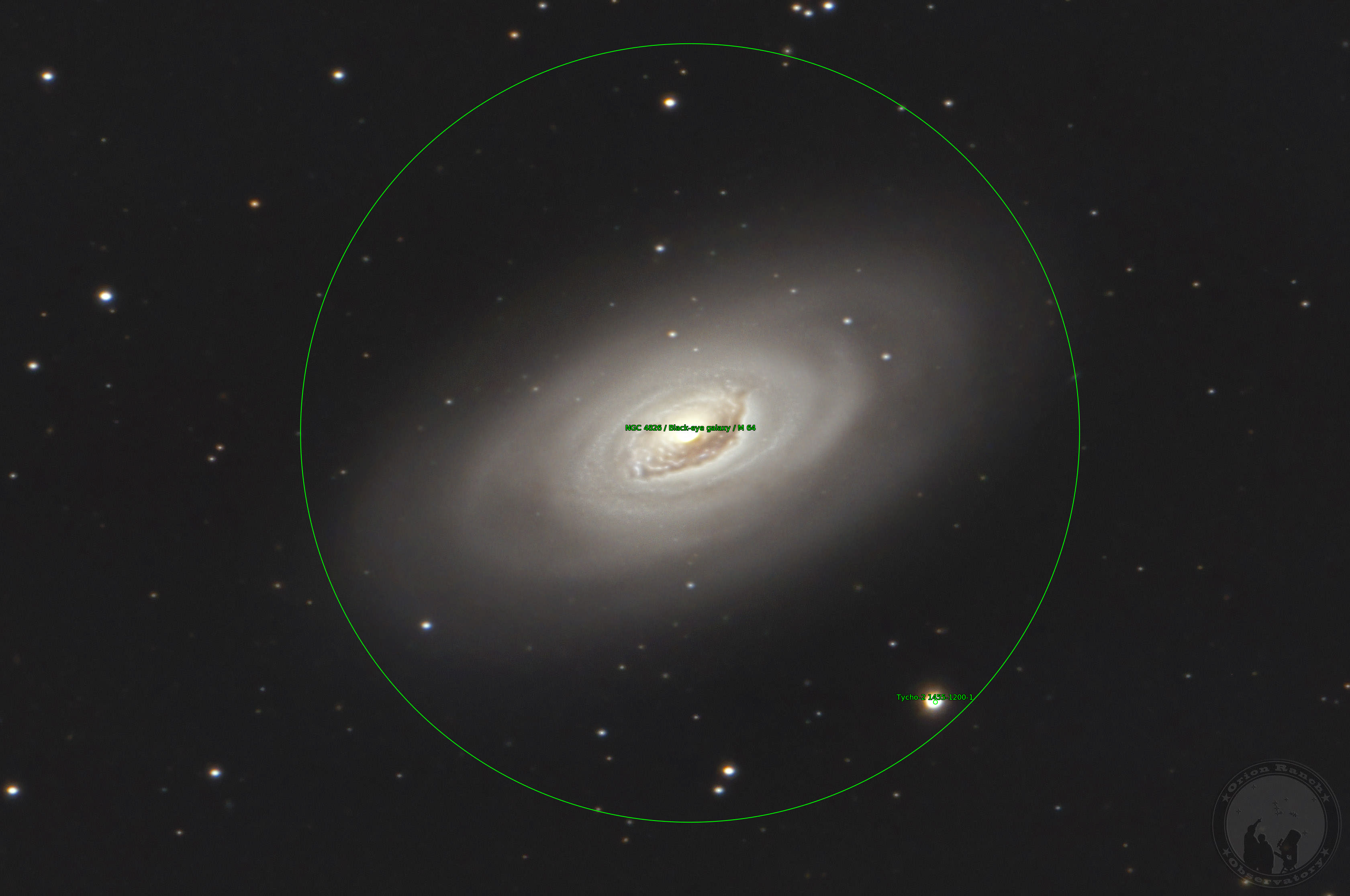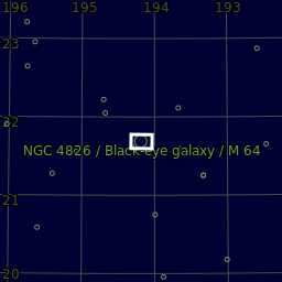 Messier 64 (NGC 4826), the Black Eye Galaxy, is a spiral galaxy in the constellation Coma Berenices. It has a prominent dark band of absorbing dust in front of the galaxy's bright nucleus, giving rise to its nicknames of the "Black Eye" or "Evil Eye" galaxy. The core of the galaxy with its black eye dust band can be made out with a large aperture telescope in dark skies.