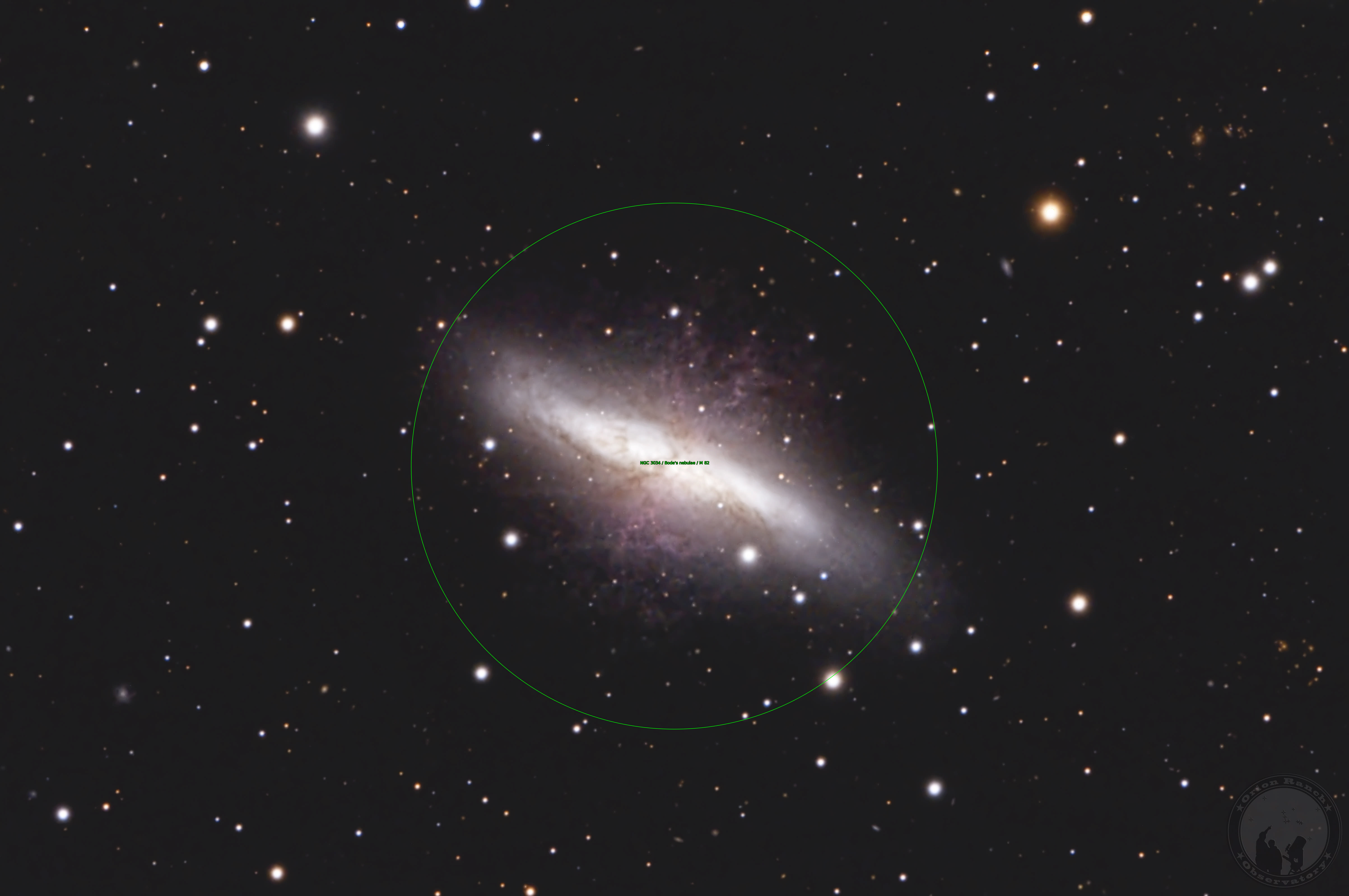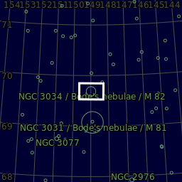 Messier 82 (NGC 3034), the Cigar Galaxy is a "starburst" galaxy in the constellation Ursa Major (the Big Bear) and is visible along with M81, Bode's Nebula, just off the end of the dipper portion of the Big Dipper in Ursa Major. The galaxy is seen edge-on from Earth, giving it the cigar shape visible through a typical telescope. It is approximately 12 million light-years away.