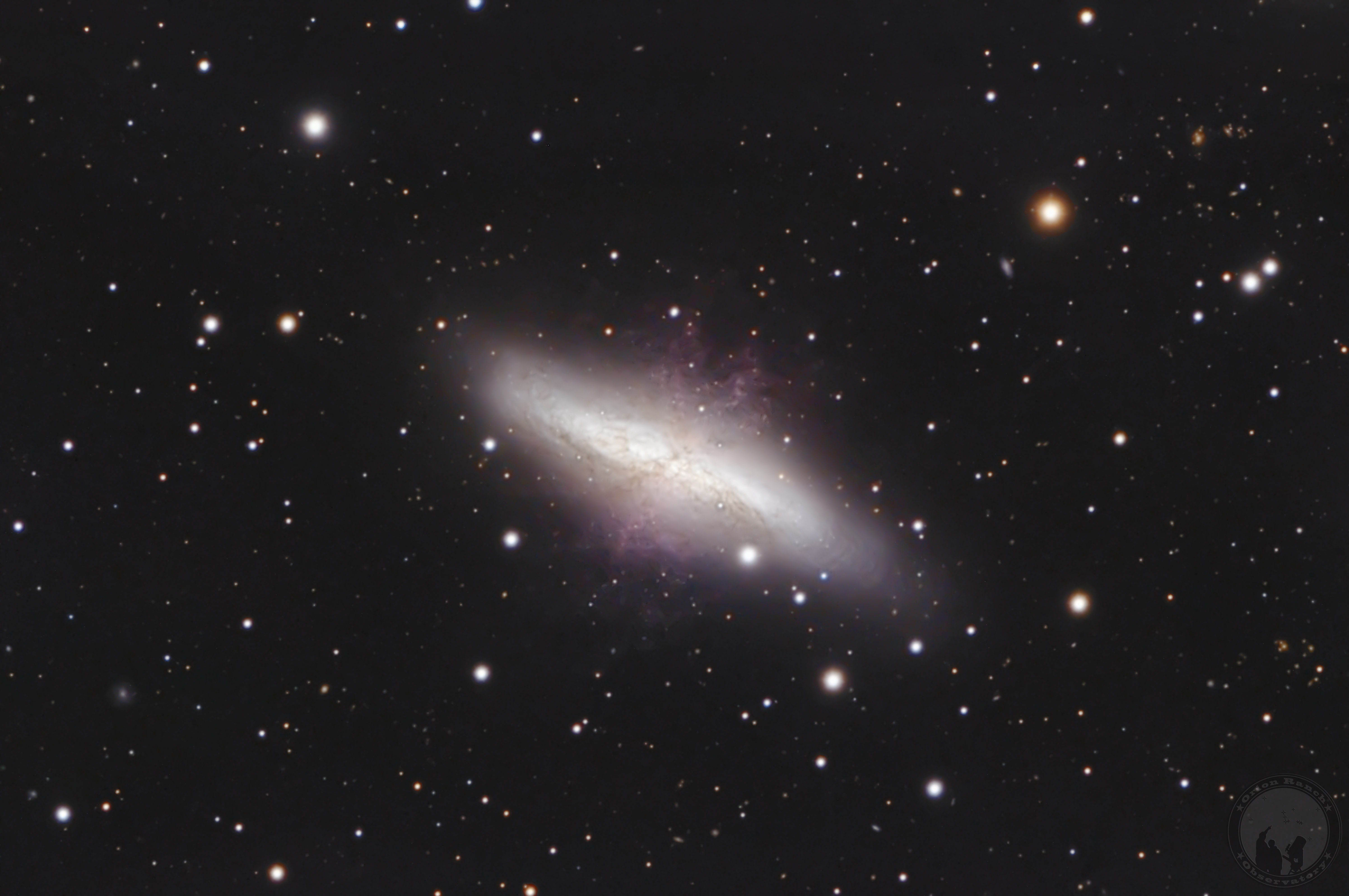 Messier 82 (NGC 3034), the Cigar Galaxy is a "starburst" galaxy in the constellation Ursa Major (the Big Bear) and is visible along with M81, Bode's Nebula, just off the end of the dipper portion of the Big Dipper in Ursa Major. The galaxy is seen edge-on from Earth, giving it the cigar shape visible through a typical telescope. It is approximately 12 million light-years away.