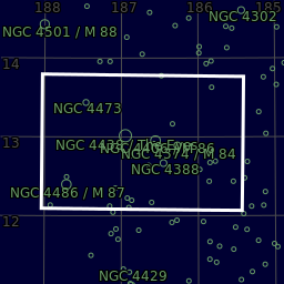 Principal objects in field: IC 3311, M 84, M 86, M 87, NGC 4305, NGC 4374, NGC 4388, NGC 4402, NGC 4406, NGC 4413, NGC 4425, NGC 4435, NGC 4438, NGC 4461, NGC 4473, NGC 4477, NGC 4486, The Eyes