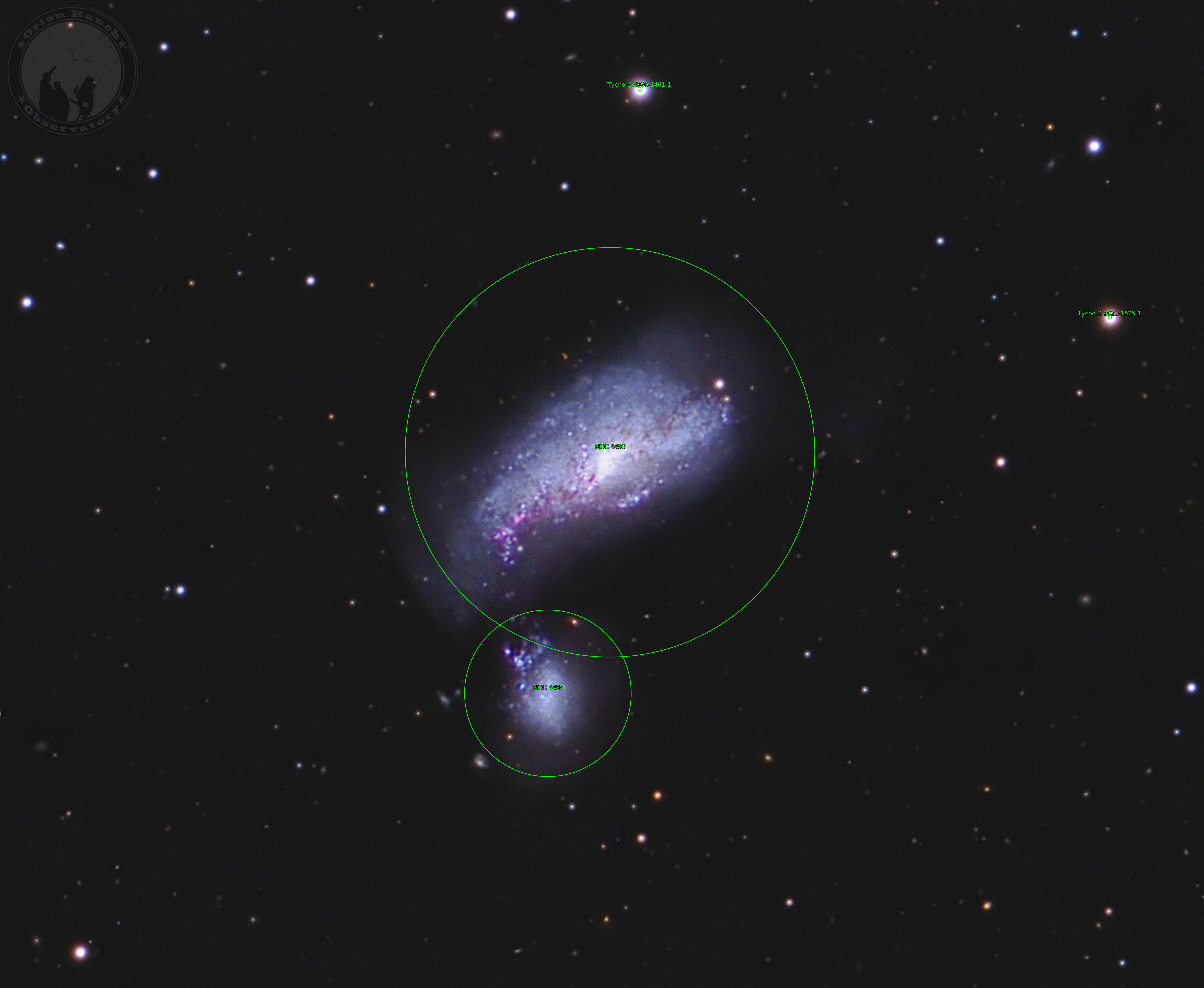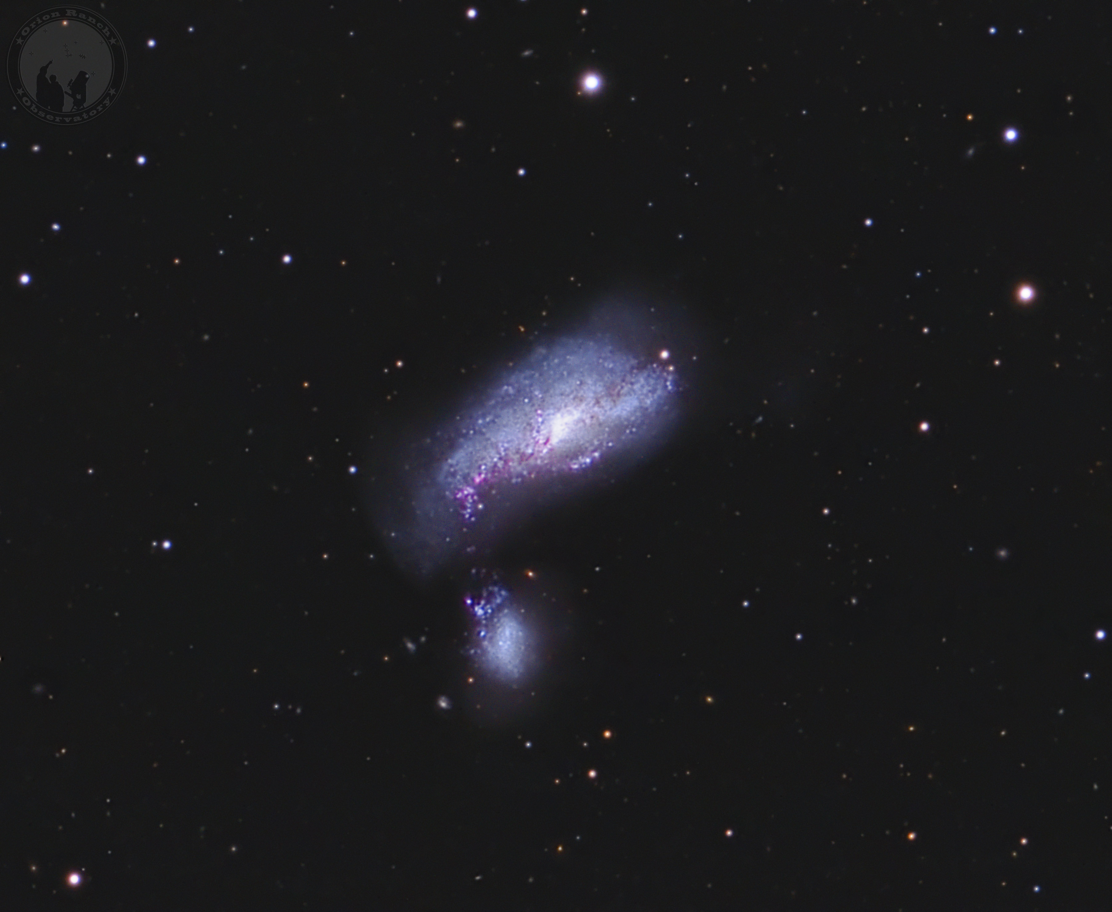 NGC 4490, the Cocoon Galaxy, is a barred spiral galaxy that can be seen interacting with its smaller companion NGC 4485, resulting in it being a starburst galaxy similar to M82. It lies in the constellation Canes Venatici at a distance of 25 million light years from Earth.