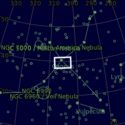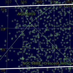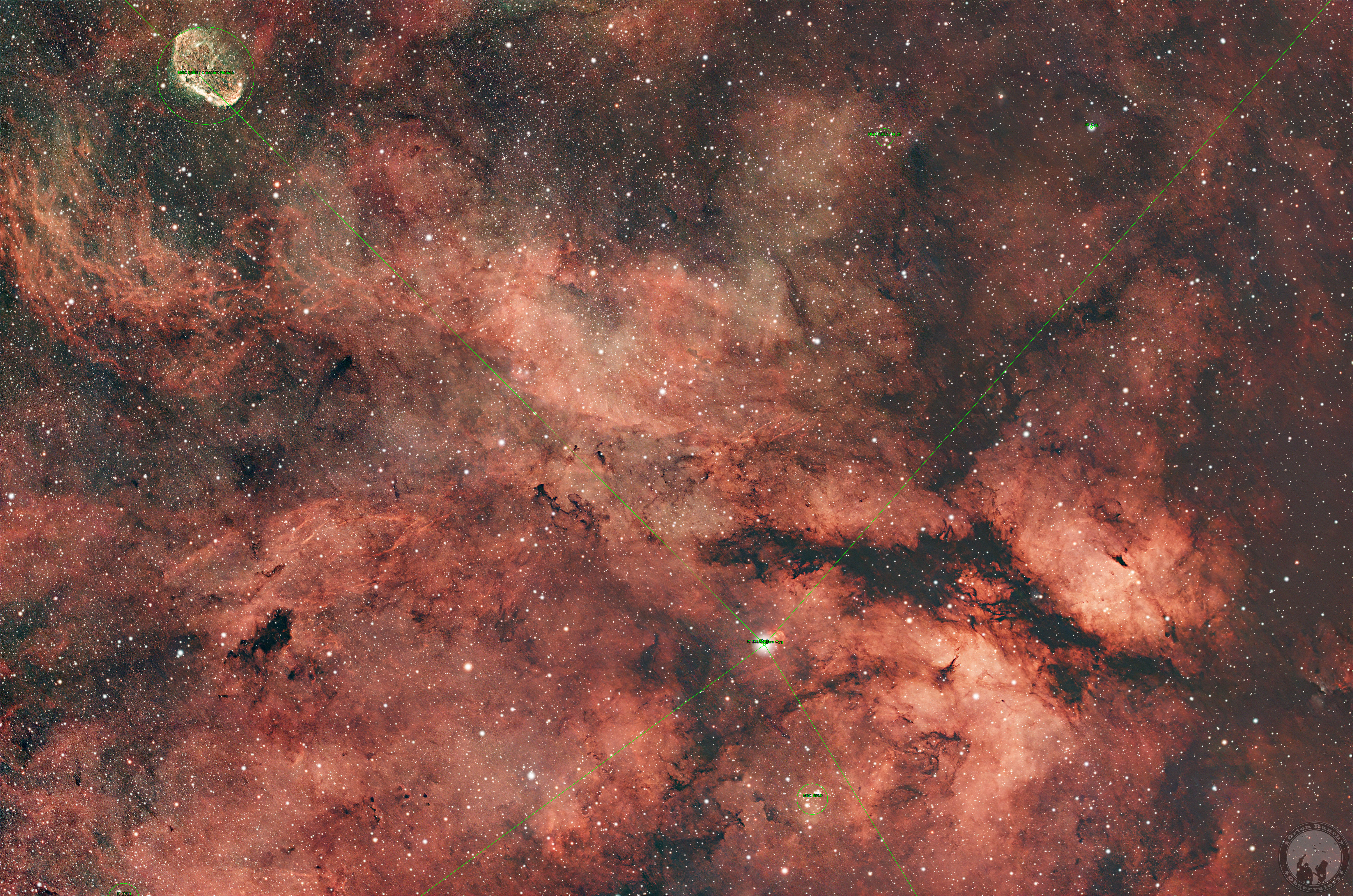 The Gamma Cygni/Butterfly Nebula ((also known as IC 1318 or the Sadr Region) is the diffuse emission nebula surrounding Sadr (γ Cygni) at the center of Cygnus's cross. This wide-field image also includes the Crescent Nebula (NGC 6888) at the upper left corner. The region contains many dark nebulae in addition to the emission diffuse nebulae.