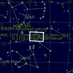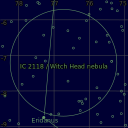 The Witch Head Nebula (IC 2118) is an extremely faint reflection nebula at the foot (knee) of the constellation of Orion the Hunter. The nebula has the appearance of a crook-nosed witch staring into her crystal ball of the blue supergiant star Rigel, at the base of Orion. The nebula is officially in the constellation of Eridanus and lies about 900 light-years from Earth.