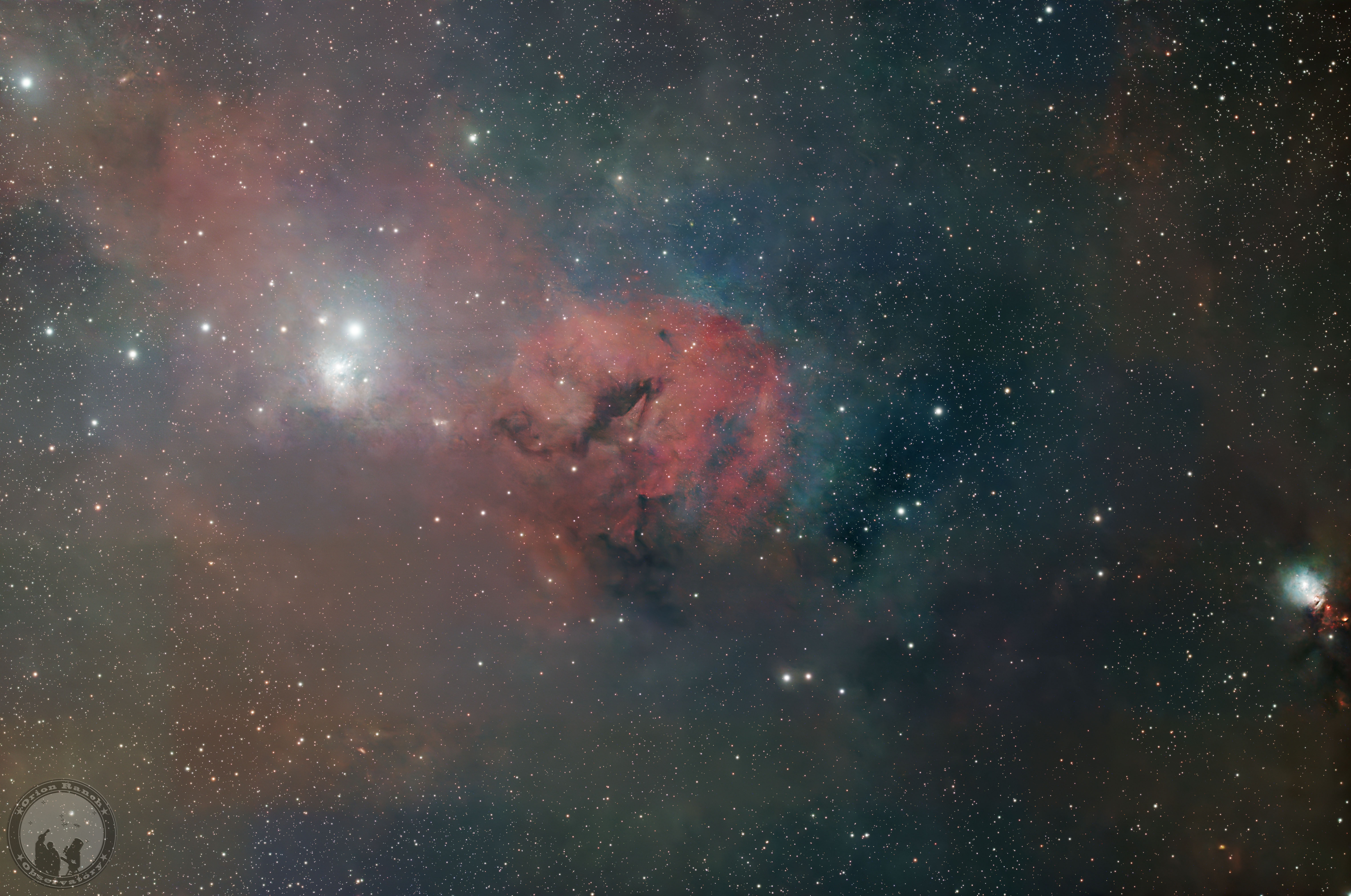 This image contains the central section of the Perseus molecular cloud (Per MCld) near the star Atik (Alatik) in the left third of the image with the star forming nebula IC 348 below it and NGC 1333 at the lower right edge. This giant molecular cloud in the constellation of Perseus is approximately 1000 light years away and contains over 10,000 solar masses of gas and dust covering an area of over 6 by 2 degrees.