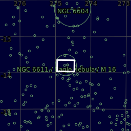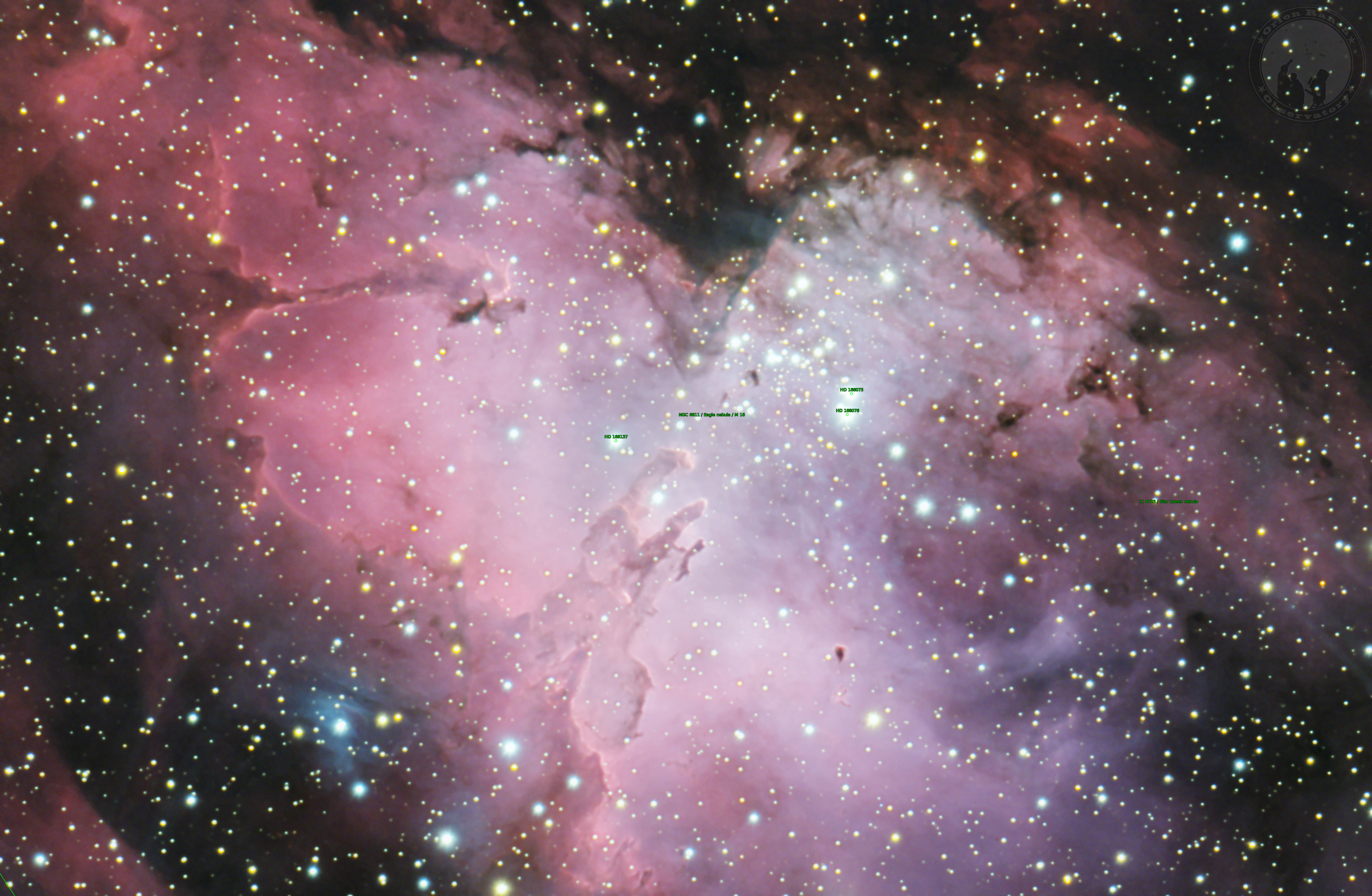 The Eagle Nebula (Messier 16 or NGC 6611), also known as the Star Queen Nebula or The Spire, is a relatively dim emission nebula around a young open cluster of stars in the constellation Serpens. The nebula contains several active star-forming gas and dust regions, including the "Pillars of Creation" area made famous in images by the Hubble Space Telescope. IC 4703 is the diffuse emission nebula or HII region associated with M 16. While the open cluster is easily identified through an average telescope, the nebula is only barely perceptible with a large aperture telescope in extremely dark skies.