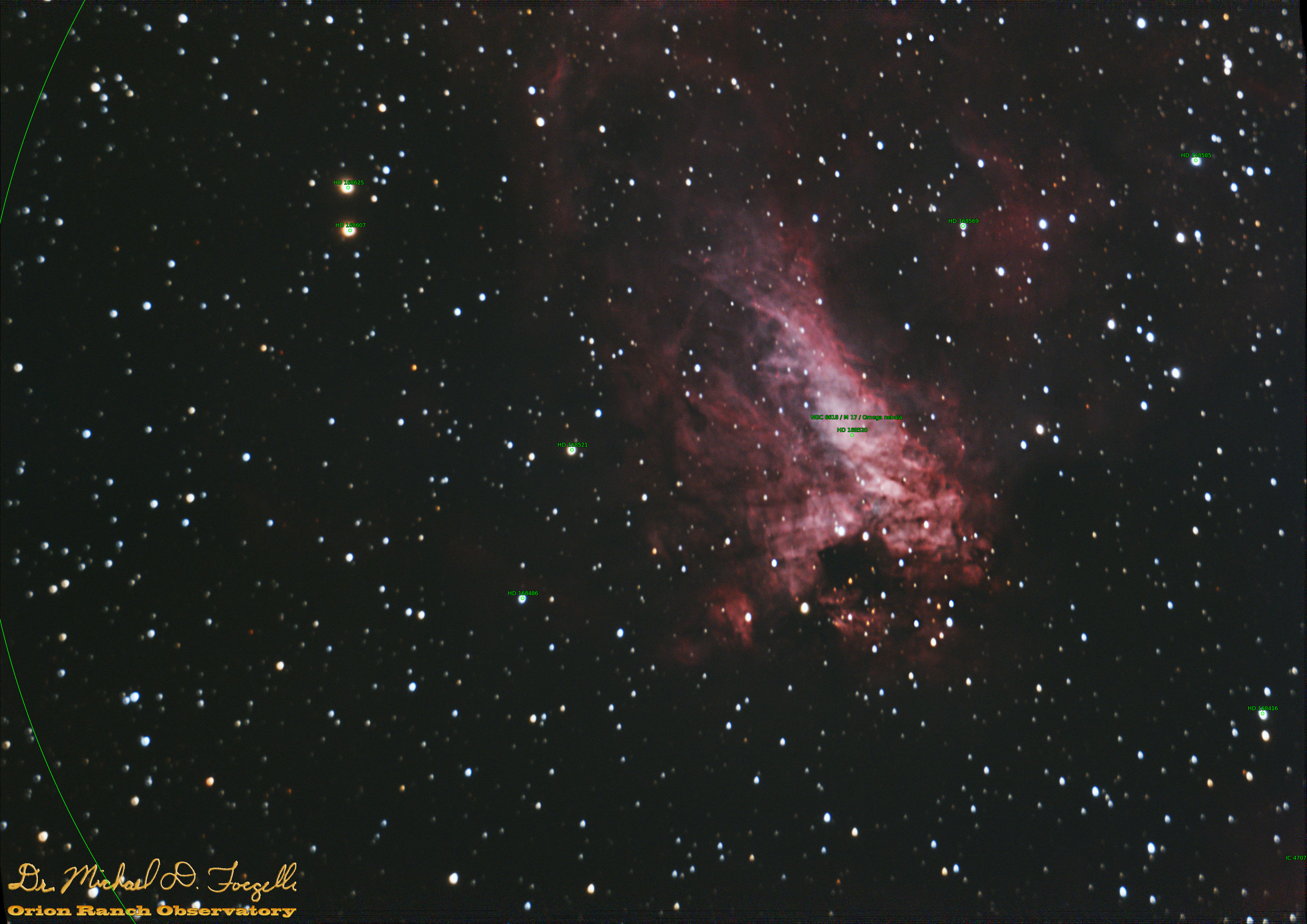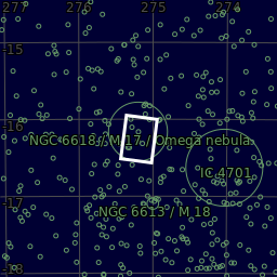 Principal objects in field: M 17, NGC 6618, Omega nebula