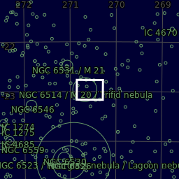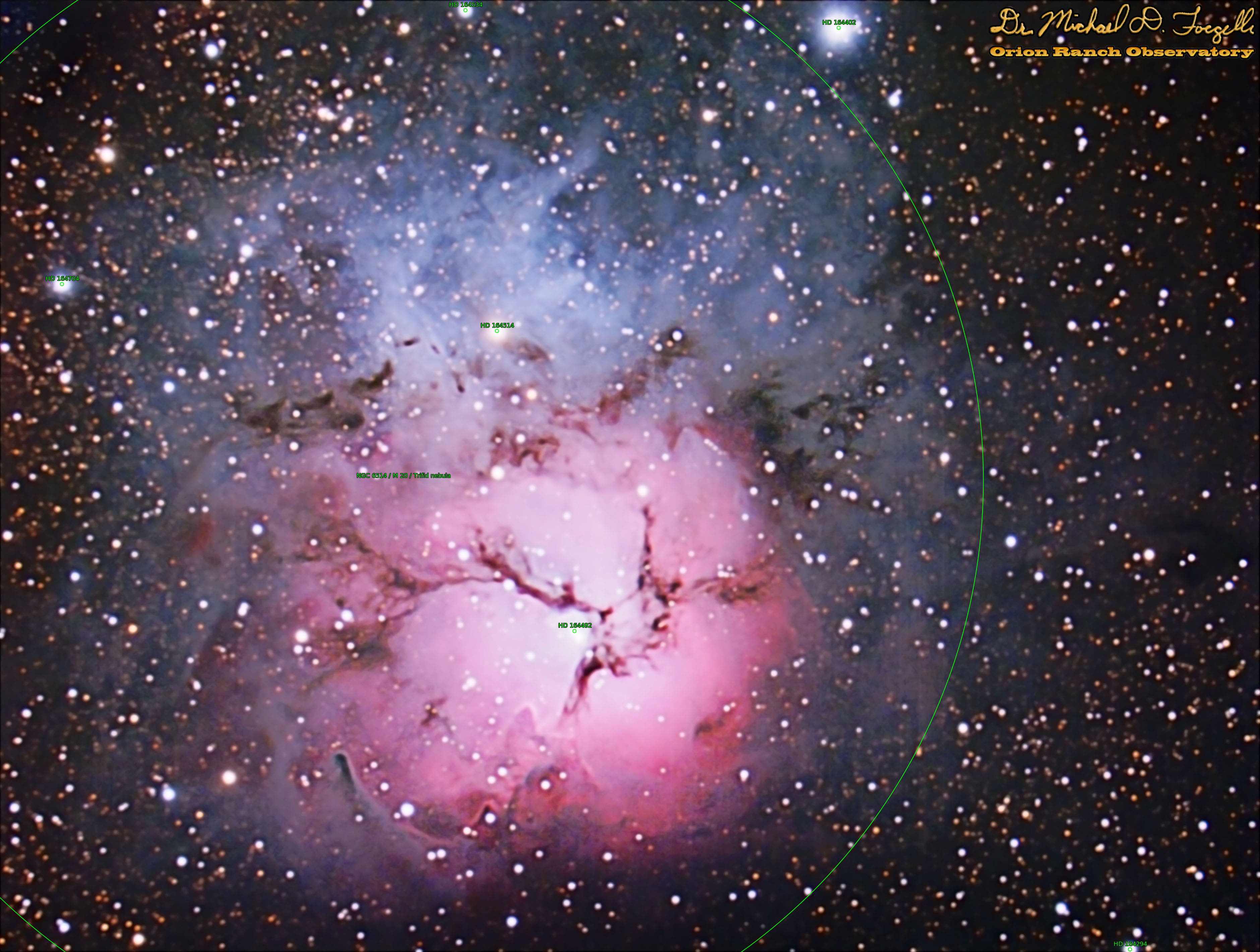 Close-up shot of the Trifid Nebula (Messier 20 or NGC 6514) in the constellation Sagittarius. The Trifid is an impressive combination of an open cluster of stars, an emission nebula (red), a reflection nebula (blue), and a dark nebula dust trails in front of the other two. This shot is a stack of 80 five-minute subs (6.67 hours of exposures) taken with my 11" Celestron Edge HD and 0.7x focal reducer using the Celestron Nightscape CCD. The images were stacked in DSS and processed in Photoshop.