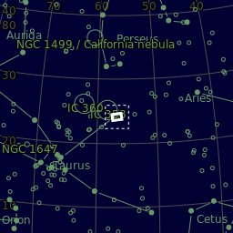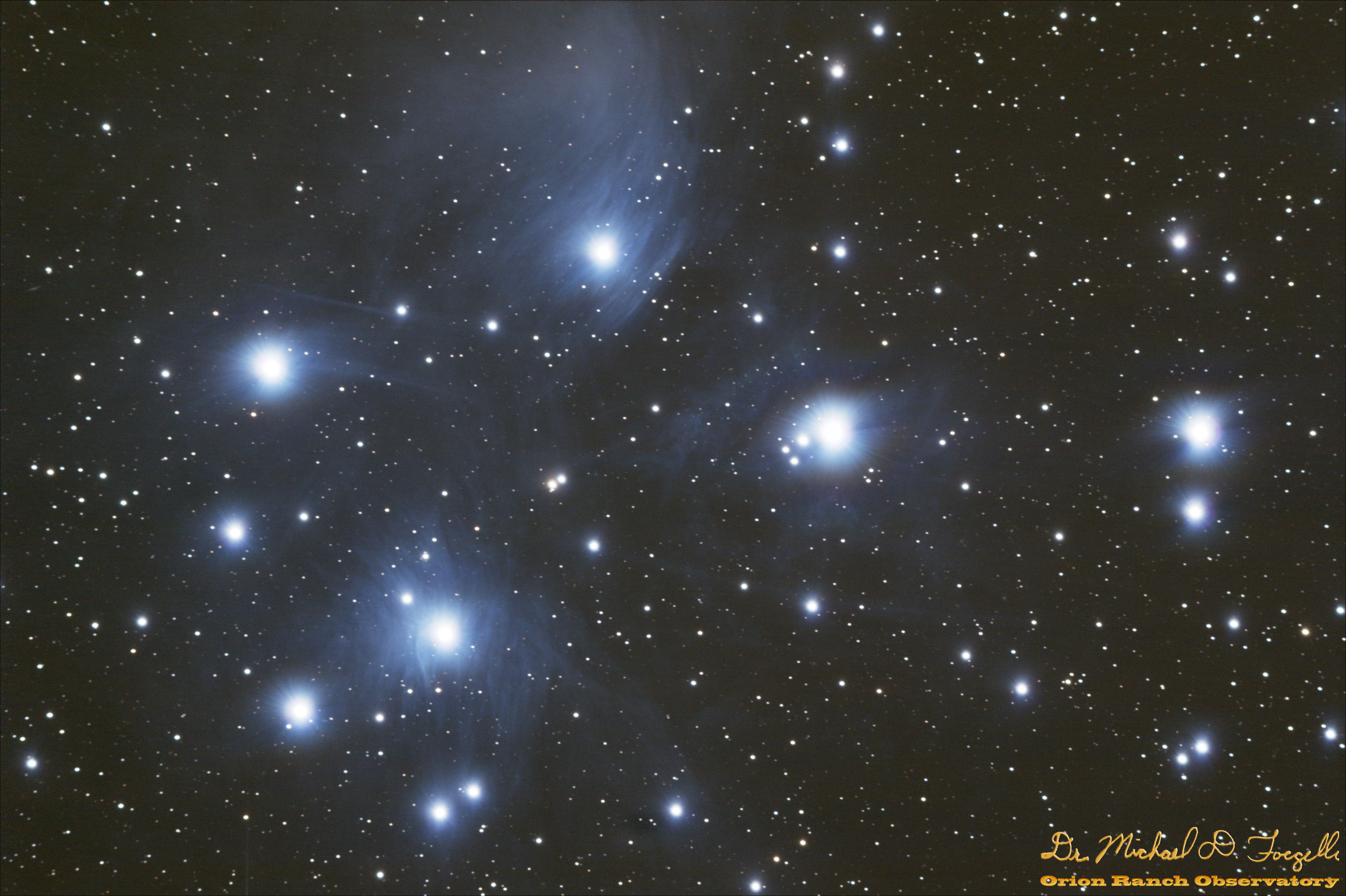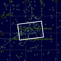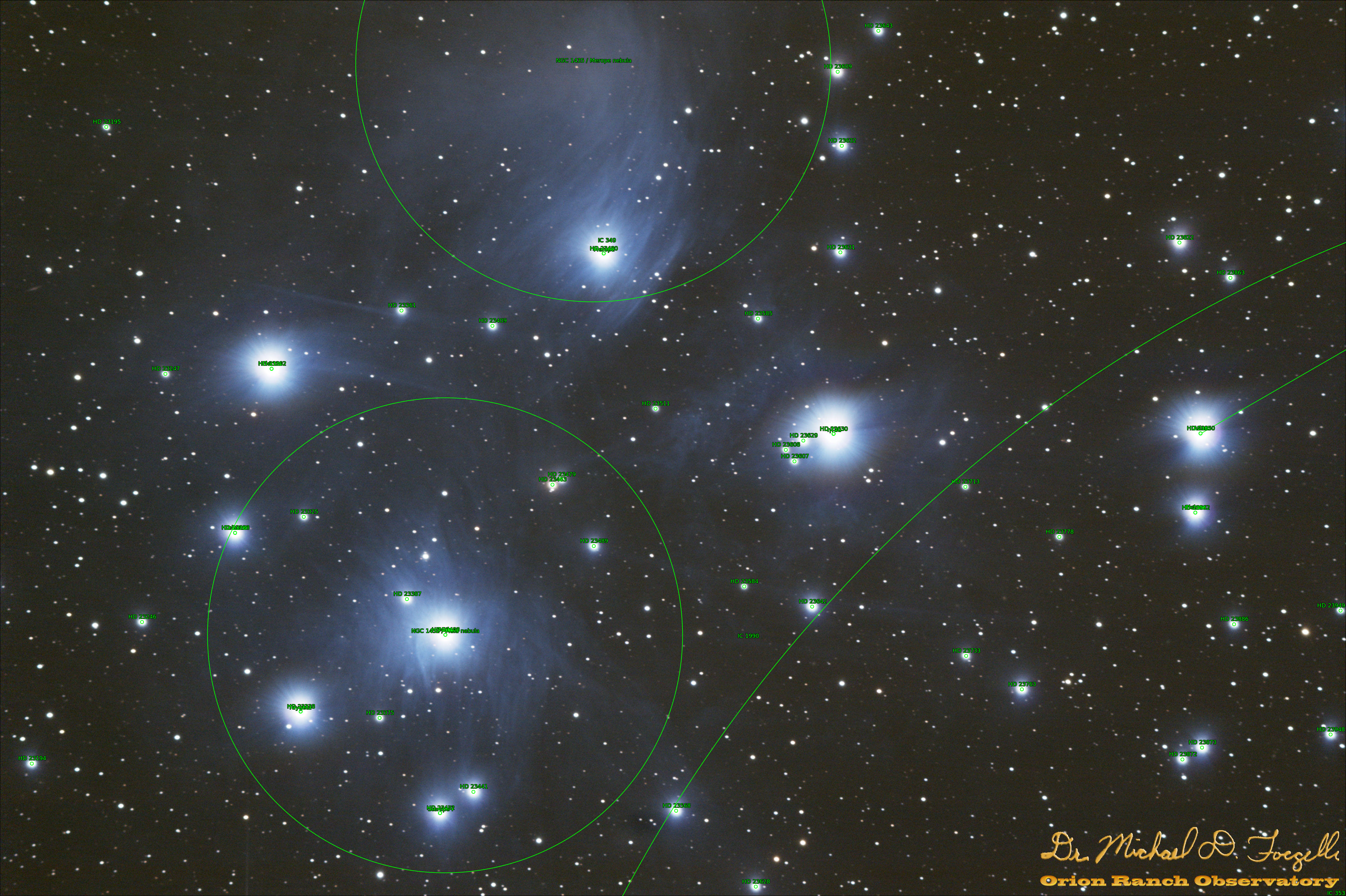 Principal objects in field: Maia nebula, Merope nebula, NGC 1432, NGC 1435, The star Atlas (27Tau), The star Celaeno (16Tau), The star Electra (17Tau), The star Merope (23Tau), The star Pleione (28Tau), The star Sterope I (21Tau), The star Taygeta (19Tau), The star ηTau