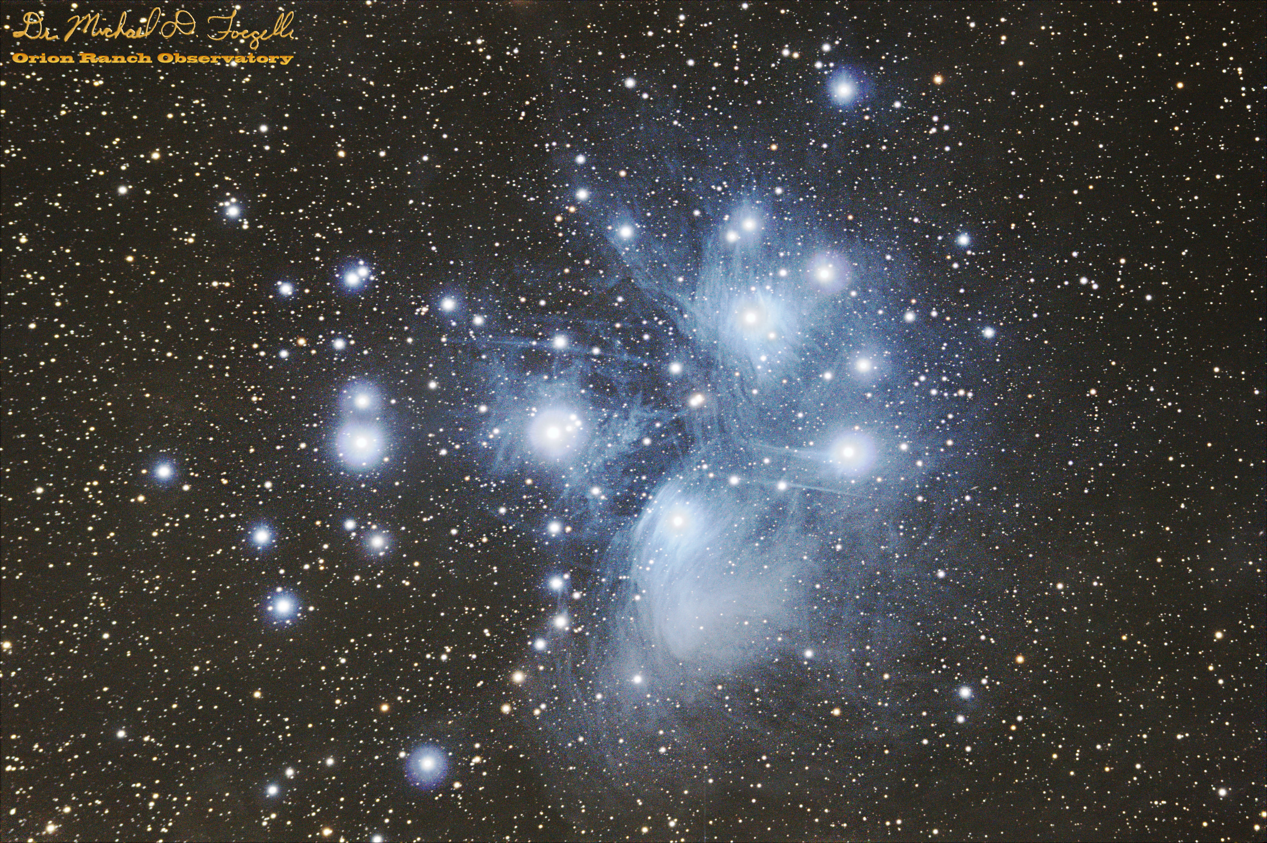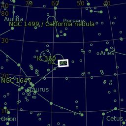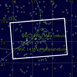 Principal objects in field: Maia nebula, Merope nebula, NGC 1432, NGC 1435, The star 18Tau, The star Atlas (27Tau), The star Celaeno (16Tau), The star Electra (17Tau), The star Merope (23Tau), The star Pleione (28Tau), The star Sterope I (21Tau), The star Taygeta (19Tau), The star ηTau
