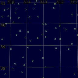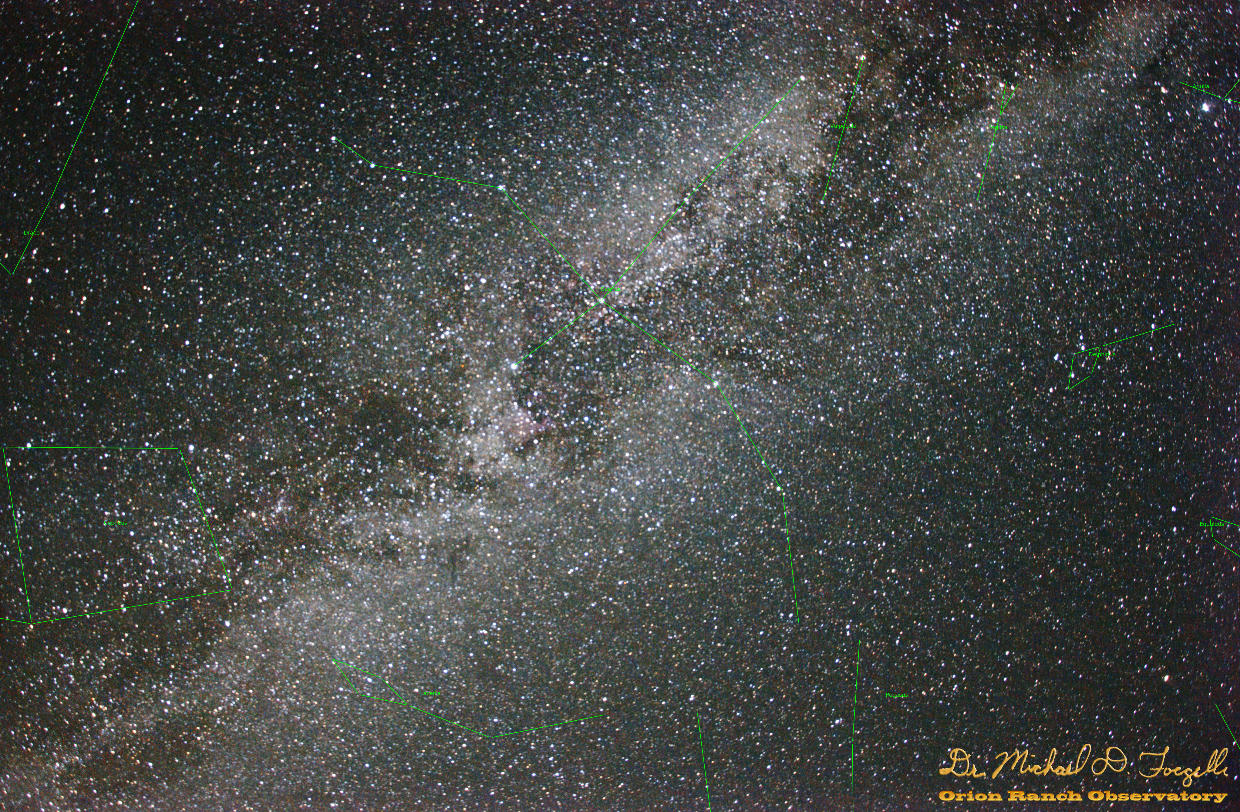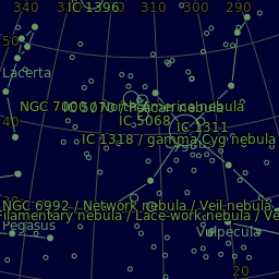 Principal objects in field: Filamentary nebula, IC 1311, IC 1318, IC 1396, IC 5068, IC 5070, Lace-work nebula, NGC 6960, NGC 6992, NGC 7000, Network nebula, North America nebula, Part of the constellation Aquila (Aql), Part of the constellation Cepheus (Cep), Part of the constellation Draco (Dra), Part of the constellation Equuleus (Equ), Part of the constellation Pegasus (Peg), Pelican nebula, The constellation Cygnus (Cyg), The constellation Delphinus (Del), The constellation Lacerta (Lac), The constellation Sagitta (Sge), The constellation Vulpecula (Vul), The star Albireo (β1Cyg), The star Alderamin (αCep), The star Altair (αAql), The star Altais (δDra), The star Deneb (αCyg), The star Enif (εPeg), The star Gienah (εCyg), The star Sadr (γCyg), The star Tarazed (γAql), The star δCyg, Veil nebula, gamma Cyg nebula
