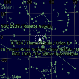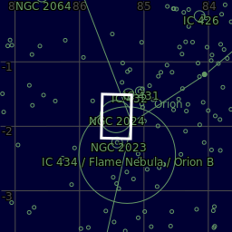 The Flame Nebula (NGC 2024 or Sh2-277) is an orange colored emission nebula in the constellation Orion near the Horsehead Nebula and just off the belt of Orion. It is about 1350 light-years away. Alnitak, the eastern most star in the Belt of Orion, provides the bright blue flare in the top of this image. With a large aperture telescope at moderate magnification, the Flame Nebula is just barely visible in very dark skies.
