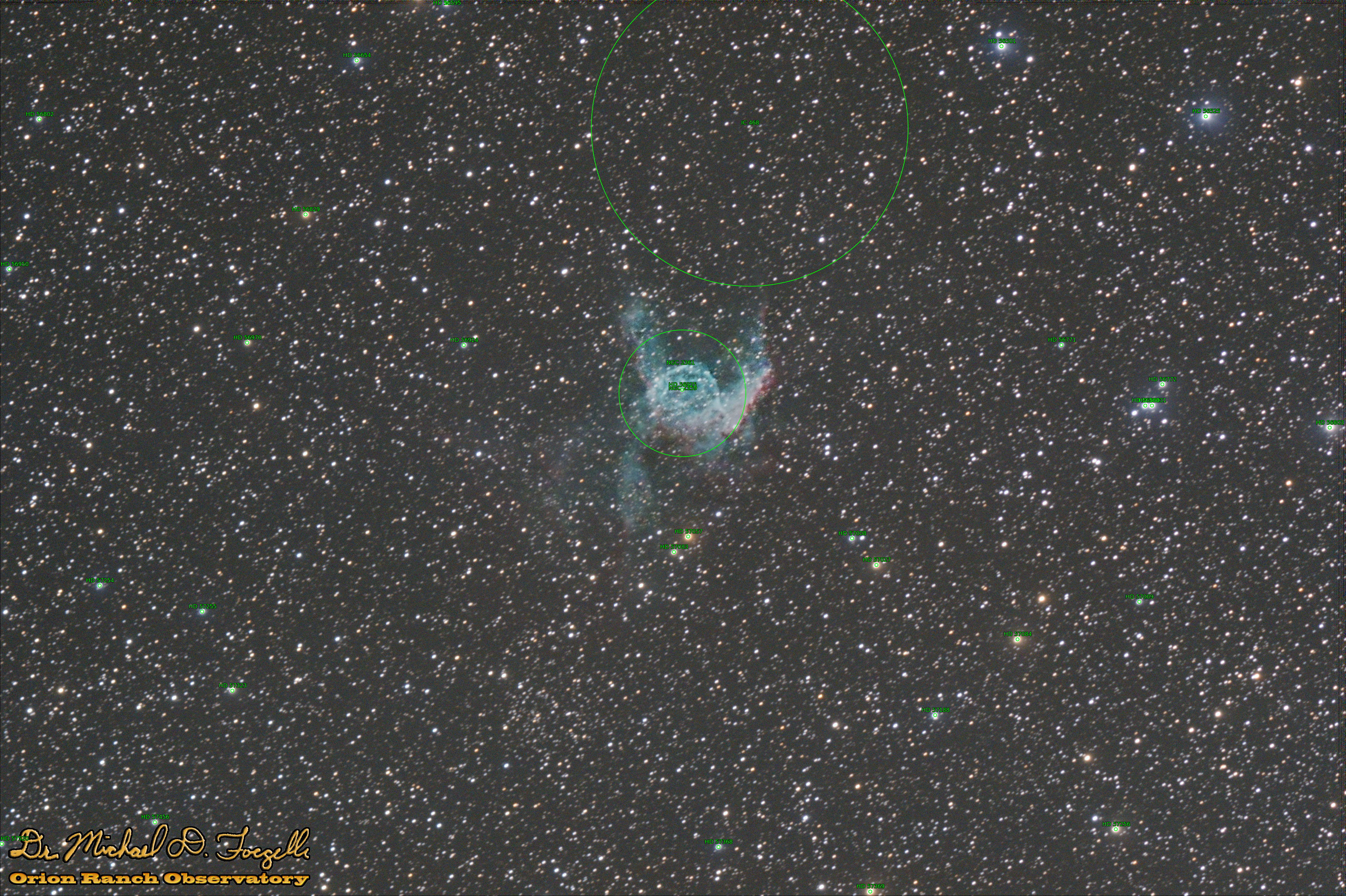 All identified catalog objects: HD 56501, HD 56525, HD 56595, HD 56654, HD 56771, HD 56772, HD 56802, HD 56803, HD 56829, HD 56830, HD 56831, HD 56924, HD 56925, HD 56950, HD 56970, HD 57008, HD 57009, HD 57027, HD 57057, HD 57083, HD 57084, HD 57188, HD 57254, HD 57255, HD 57256, HD 57323, HD 57368, HD 57369, HD 57456, HD 57520, IC 468, NGC 2359, NGC 2361