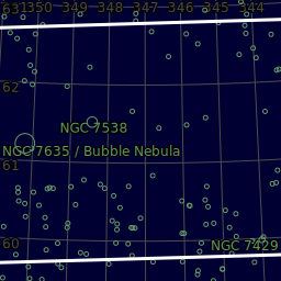 The Bubble Nebula is a hydrogen line emission nebula in the constellation Cassiopeia. The "bubble" is created by the stellar wind from a massive hot, 8.7 magnitude young central star, SAO 20575 pushing the gas away in an expanding wavefront. The nebula is near a giant molecular cloud that is also being excited by the hot central star providing the glowing background nebulosity. The Bubble Nebula was discovered in 1787 by William Herschel, but is difficult to detect visually with anything but the larger amateur telescopes in extremely dark skies.