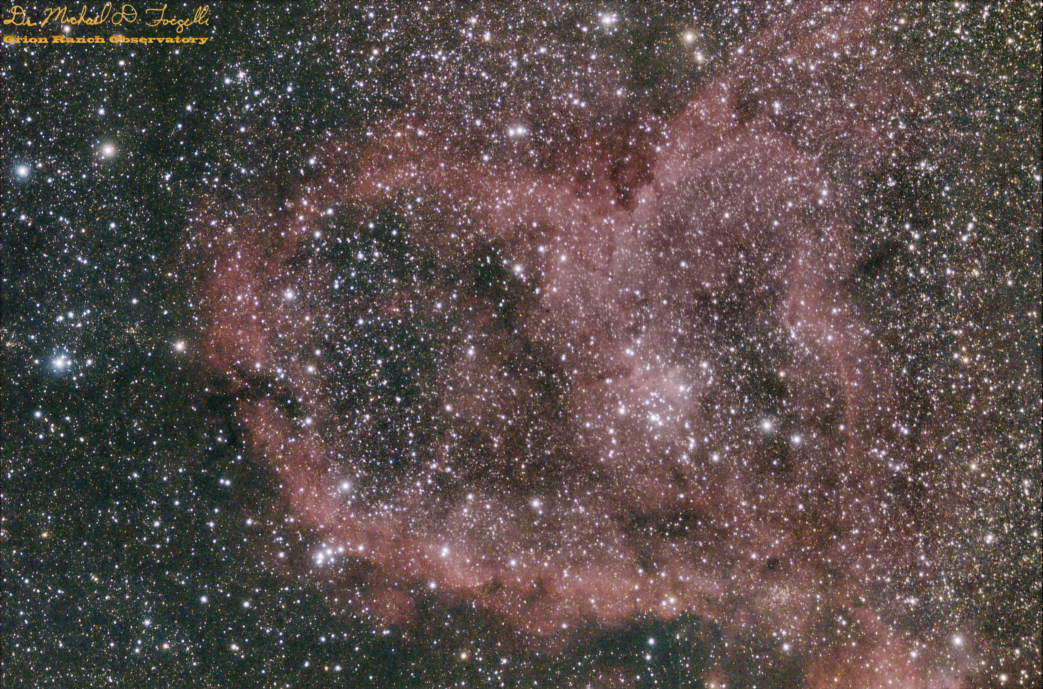 Re-process of Sh 2-190, The Heart Nebula, in the new StarTools software with a Photoshop finish. This is a stack of 23 ten-minute exposures at 1600 ISO on my modified Canon 450D in my cooler box. This was part of my foray into large dim DSOs in the middle of the Milky Way. Lots of stars in the background that are very difficult to minimize. The StarTools software really did an impressive job on this one, although there was a bit of a gradient (may be real nebula) to the right side that I had to kill with Photoshop.