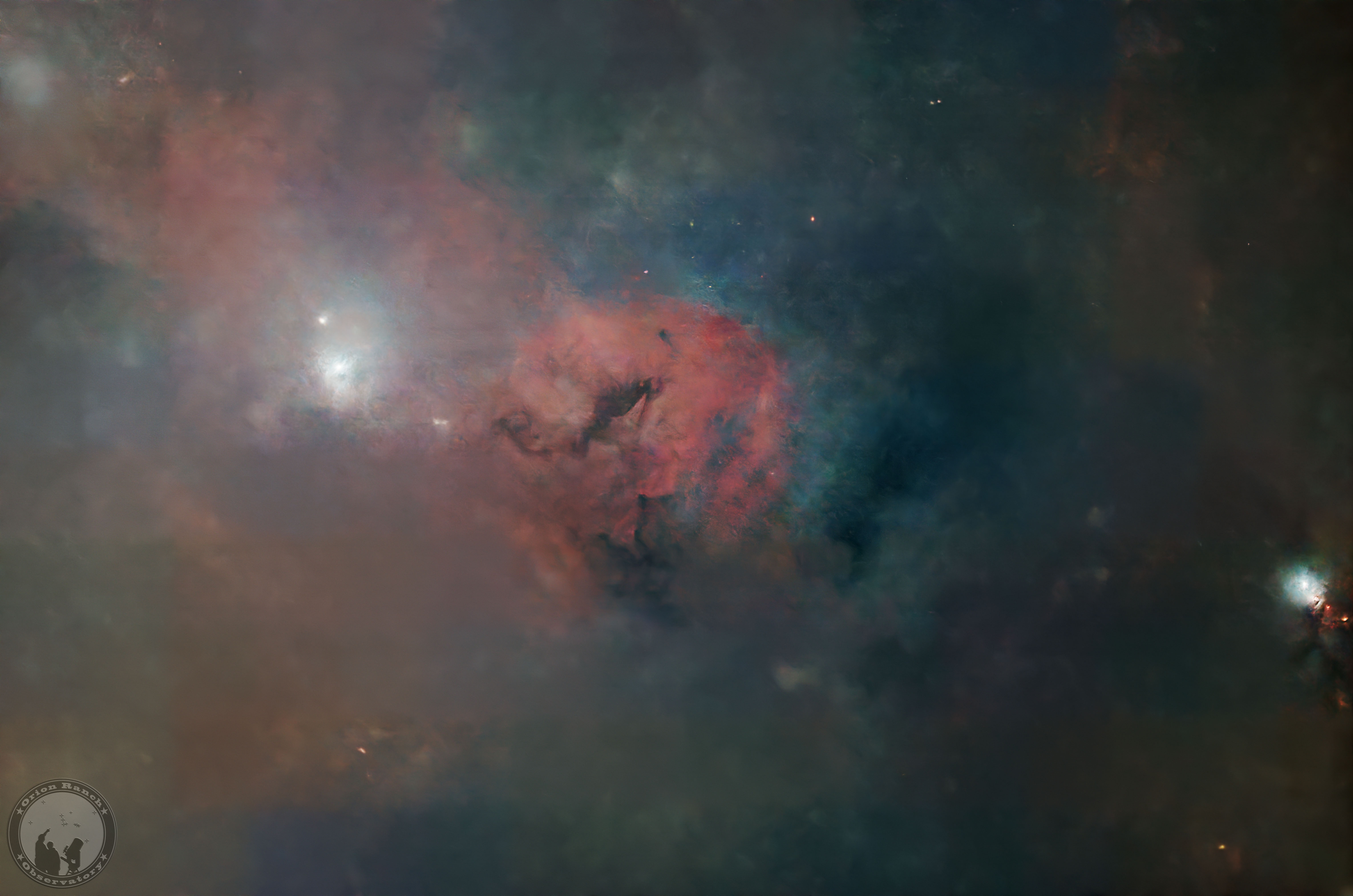 This image contains the central section of the Perseus molecular cloud (Per MCld) near the star Atik (Alatik) in the left third of the image with the star forming nebula IC 348 below it and NGC 1333 at the lower right edge. This giant molecular cloud in the constellation of Perseus is approximately 1000 light years away and contains over 10,000 solar masses of gas and dust covering an area of over 6 by 2 degrees.