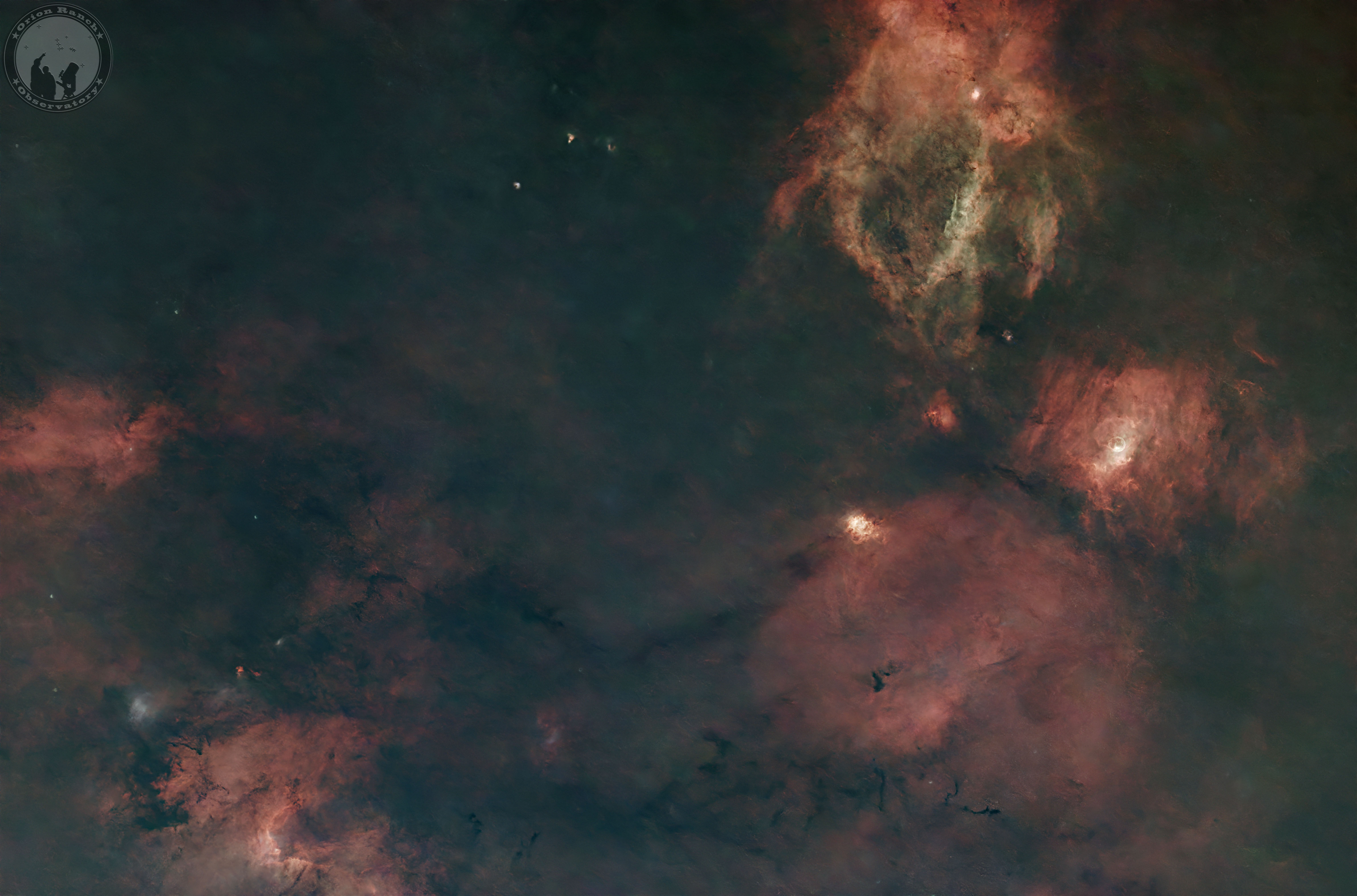 This wide field image contains multiple dim emission nebulae, with the brighter Bubble Nebula (NGC 7635) on the right hand side, and the open cluster, M52, just below and to the right of it.