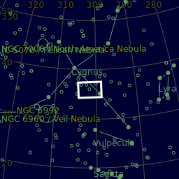 Principal objects in field: 21 Cyg, 27 Cyg, 28 Cyg, 29 Cyg, IC 1310, NGC 6871, NGC 6883, The star 25 Cyg, The star b1 Cyg, The star b2 Cyg, The star b3 Cyg, The star η Cyg