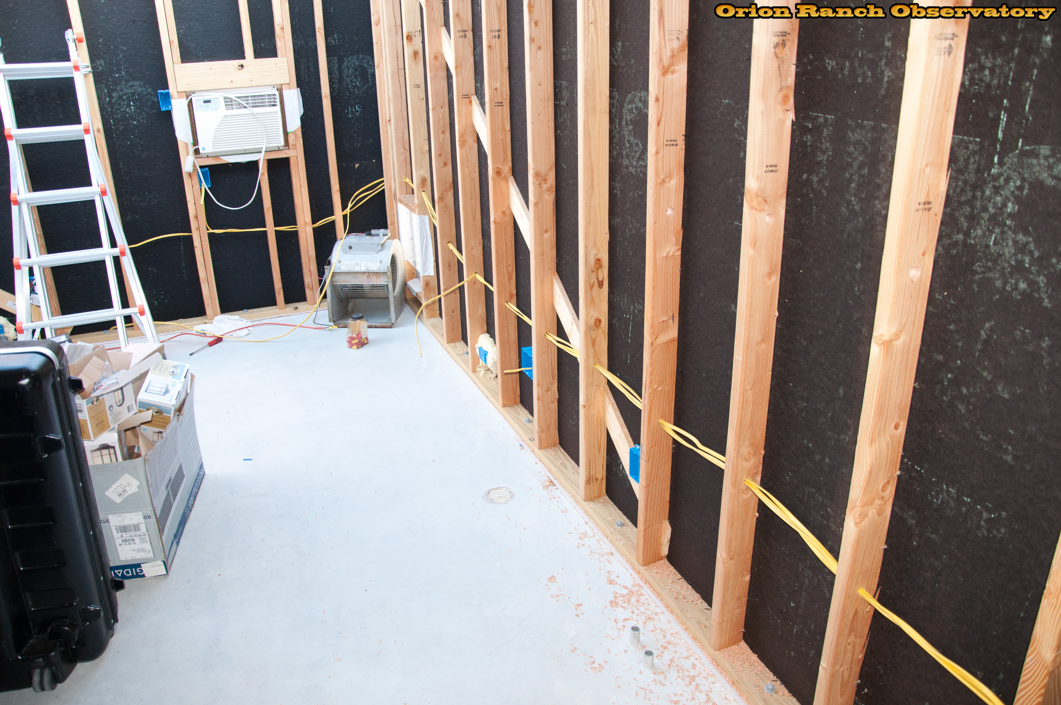 More electrical along the West and South wall of the observatory. Includes two circuits for equipment on the west wall, the previous south pier and wall circuit, and the AC/fan circuit. Also includes the light circuit from the East wall.