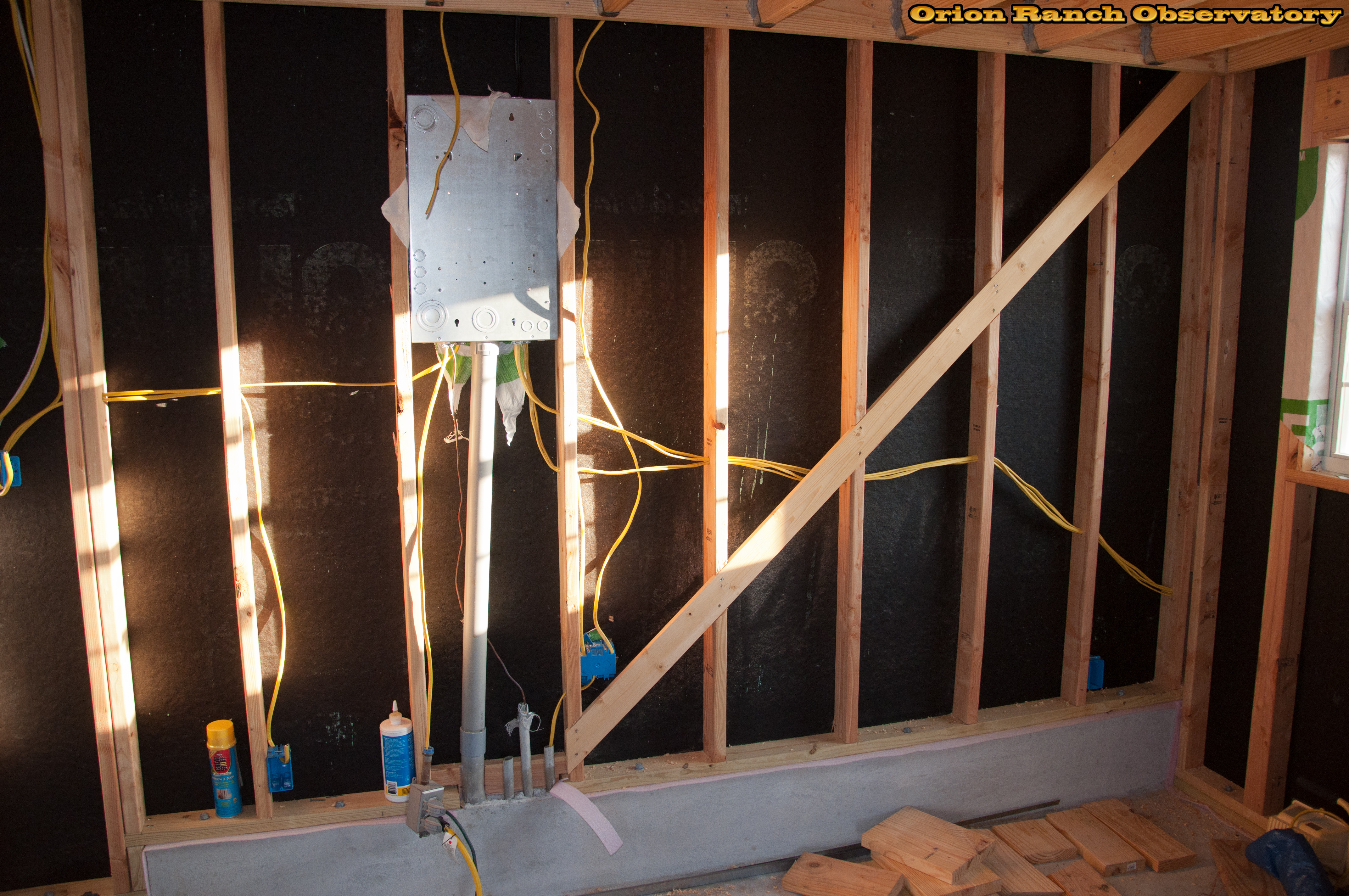 More electrical along the West and South wall of the observatory. Includes two circuits for equipment on the west wall, the previous south pier and wall circuit, and the AC/fan circuit. Also includes the light circuit from the East wall.