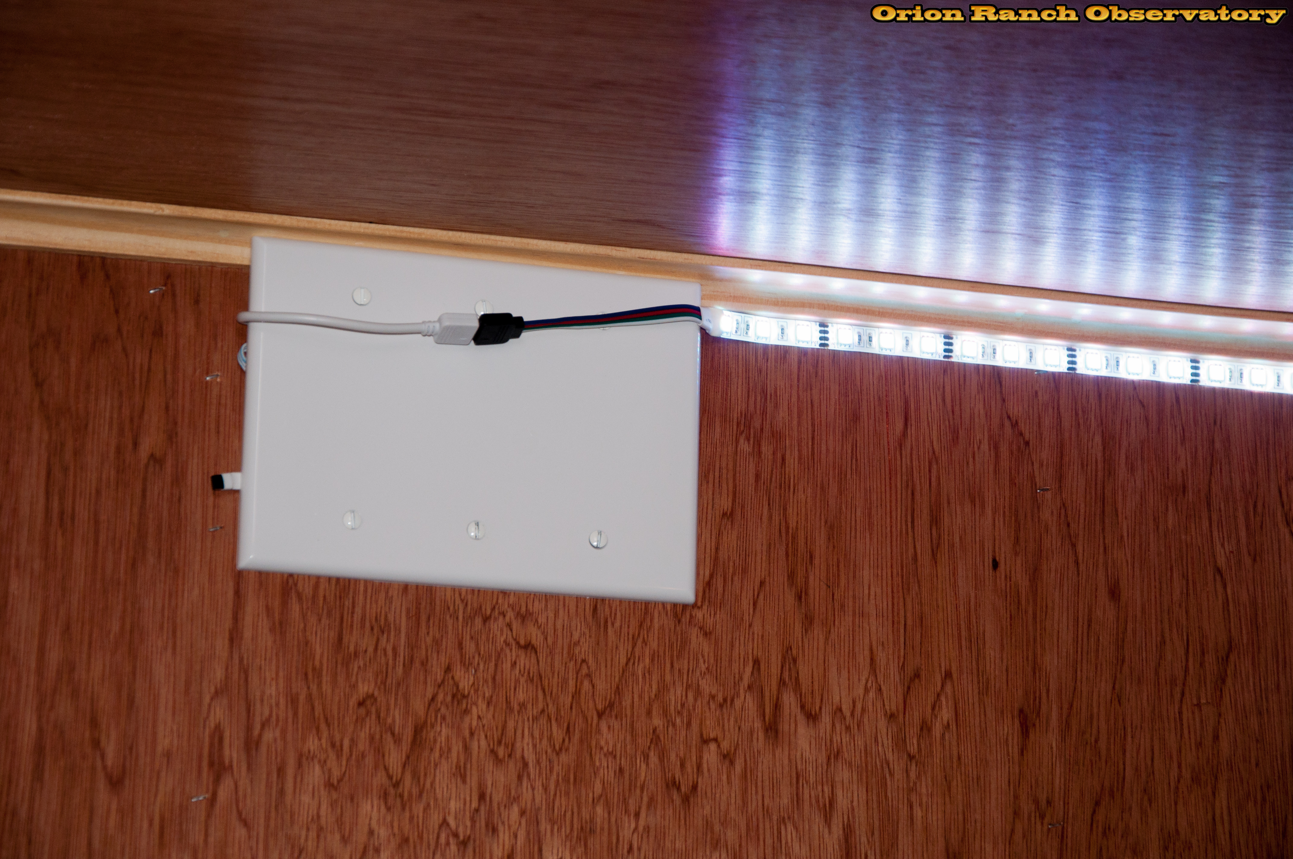 The LED strip fell down by the end of the day, so I re-attached it to the wall instead of the trim. Hopefully it will stay. Here you see it in white, with and without the flash.