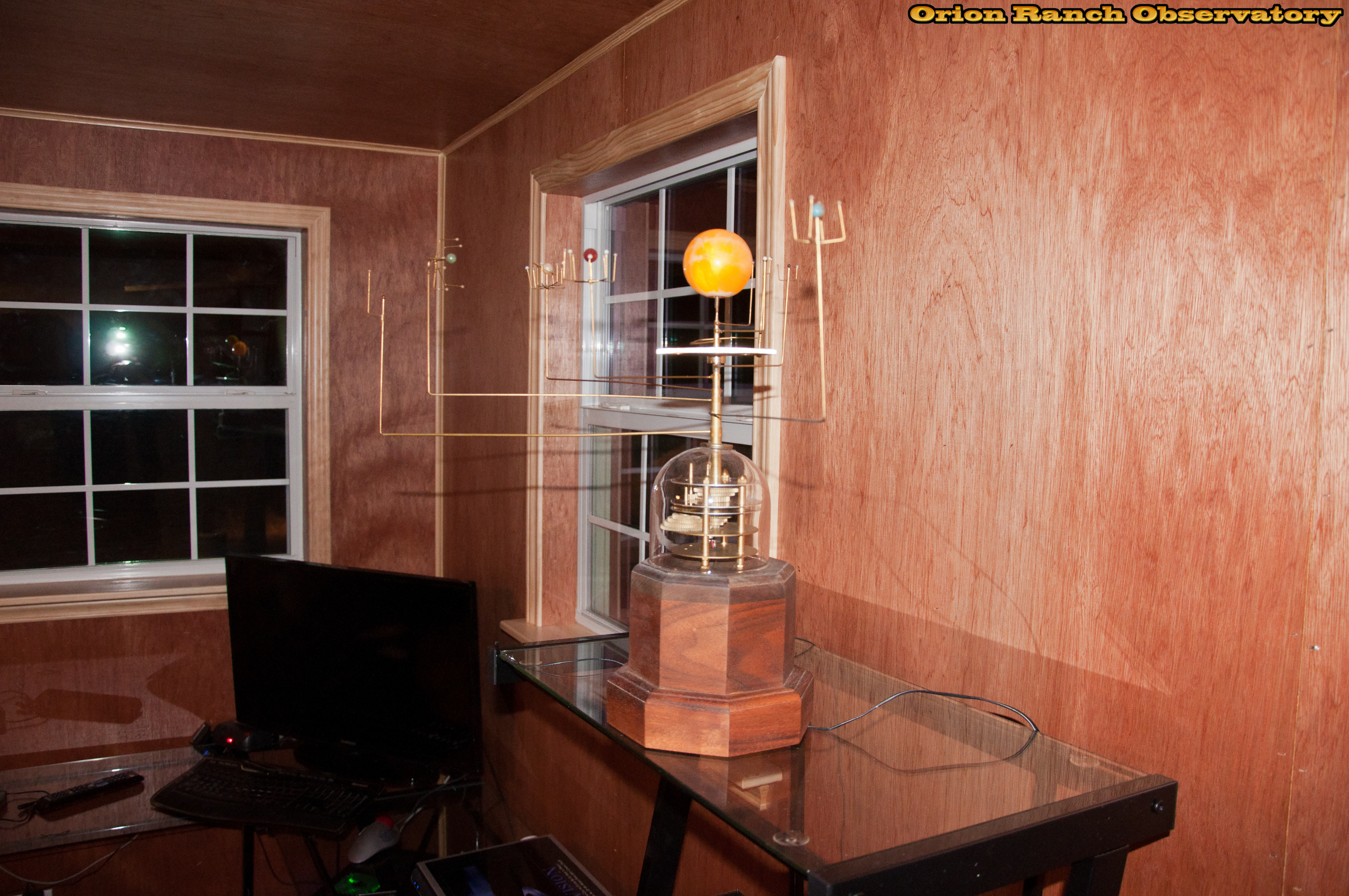 A solar system orrery that I bought damaged off e-Bay and rebuilt, including new glass dome, new planetary gear for Earth, LED lighting in the sun, and custom power supply.