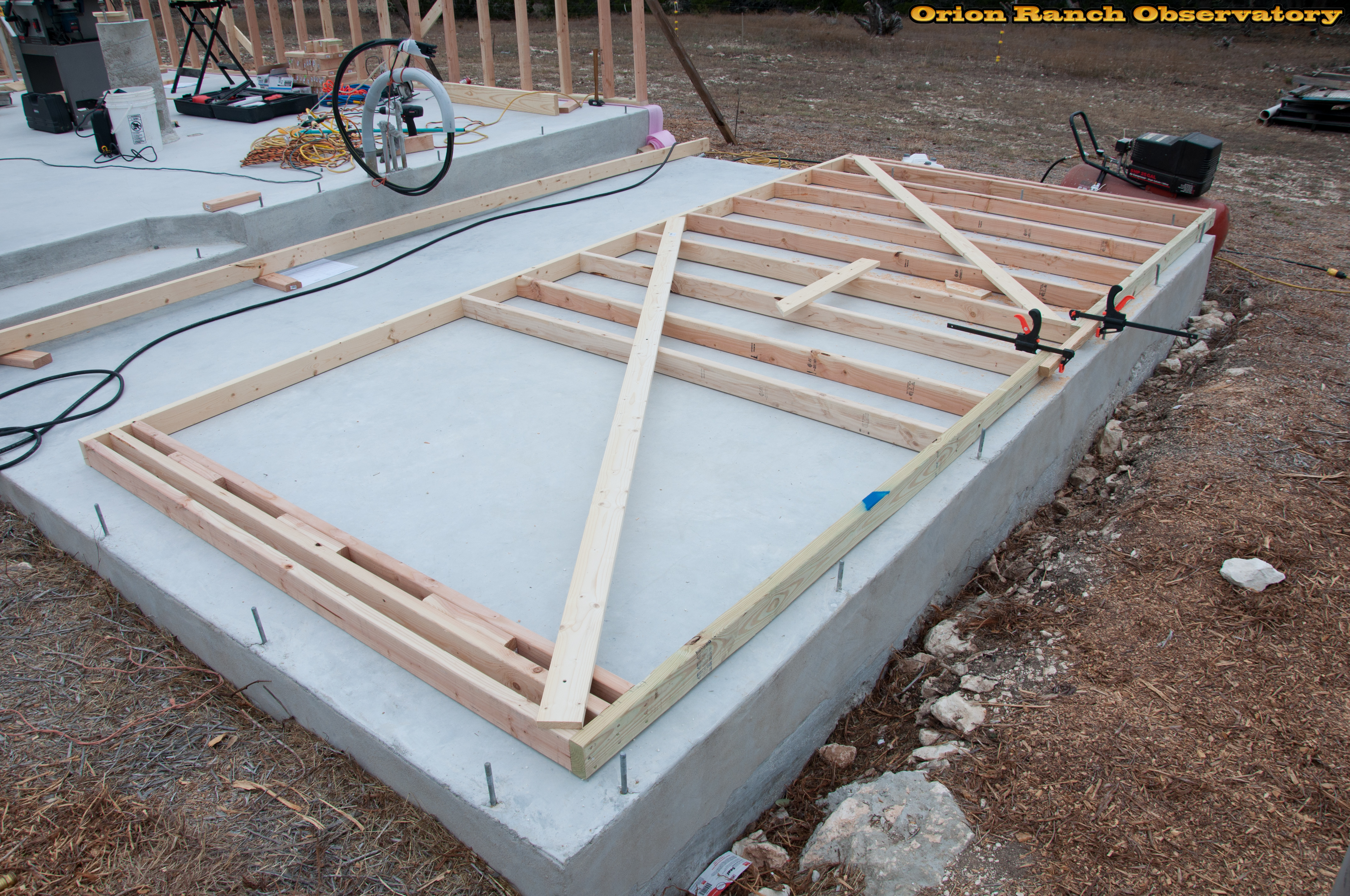 Wall frame for observatory North wall with gap for conduits/electrical and an opening for framing of the door.