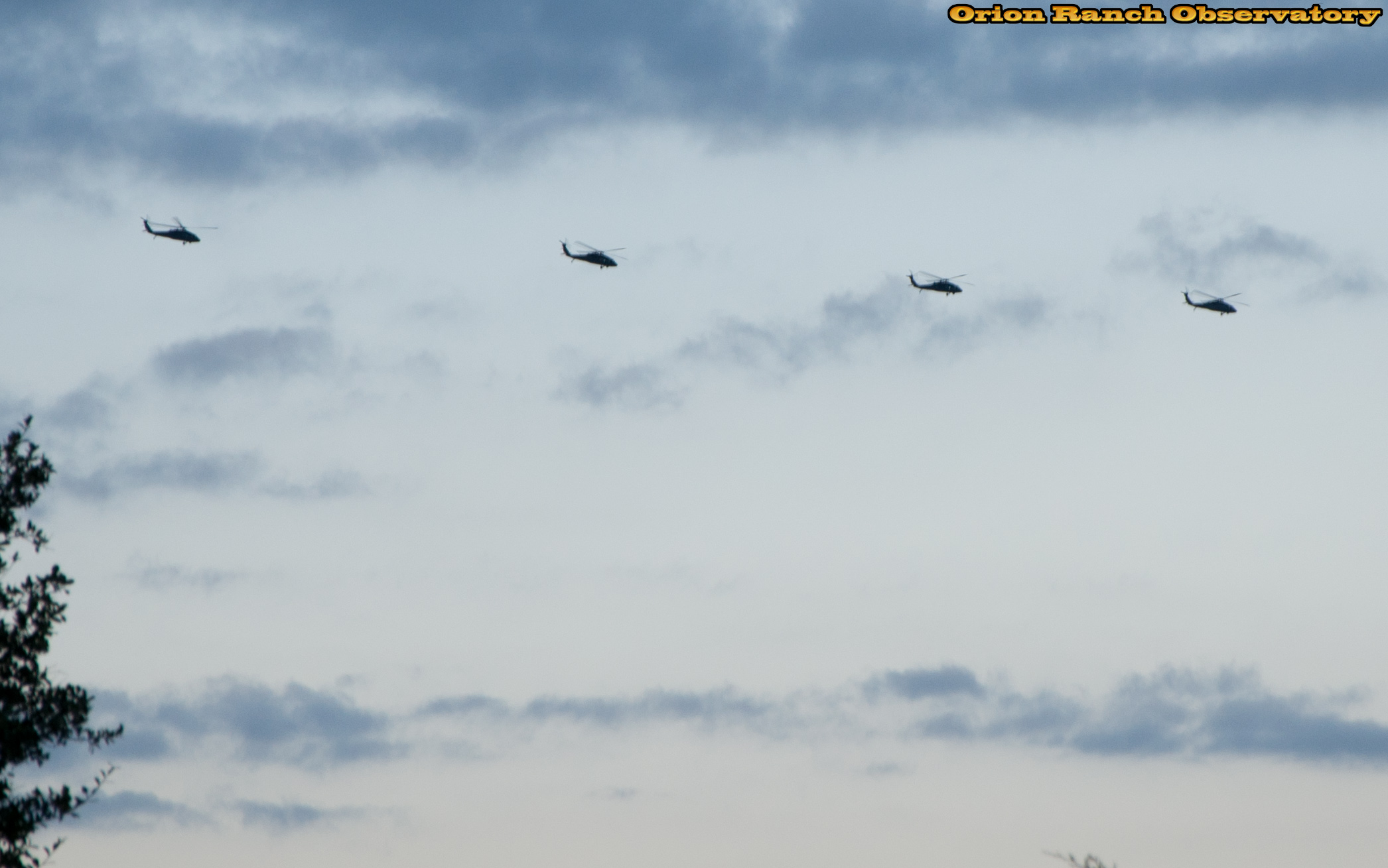 A squadron of helicopters were doing maneuvers just over the hill for quite a while and eventually headed back towards the military base.
