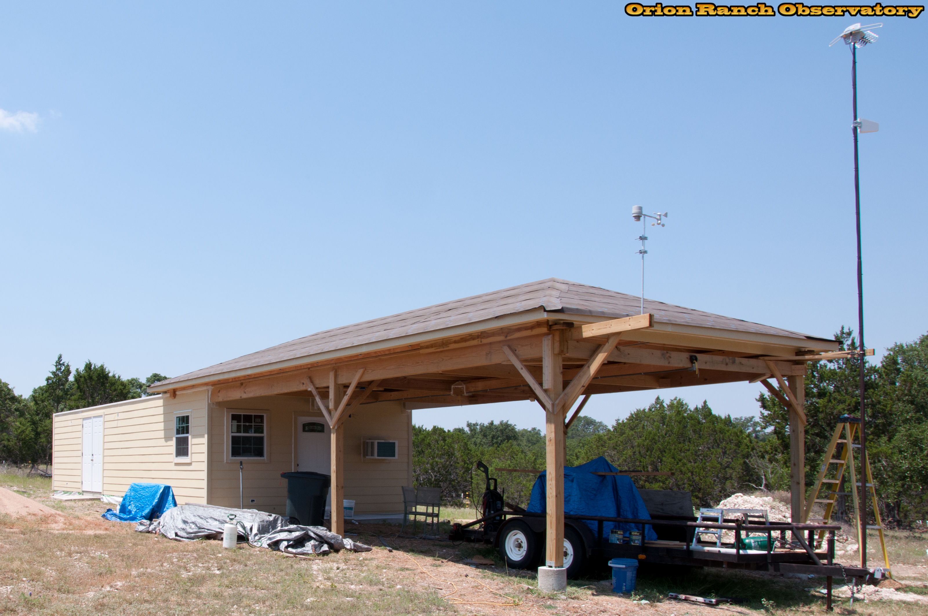 Roof rolled off to prime the top rails of the observatory. I'llustrates the clearance to the antenna mast, etc.