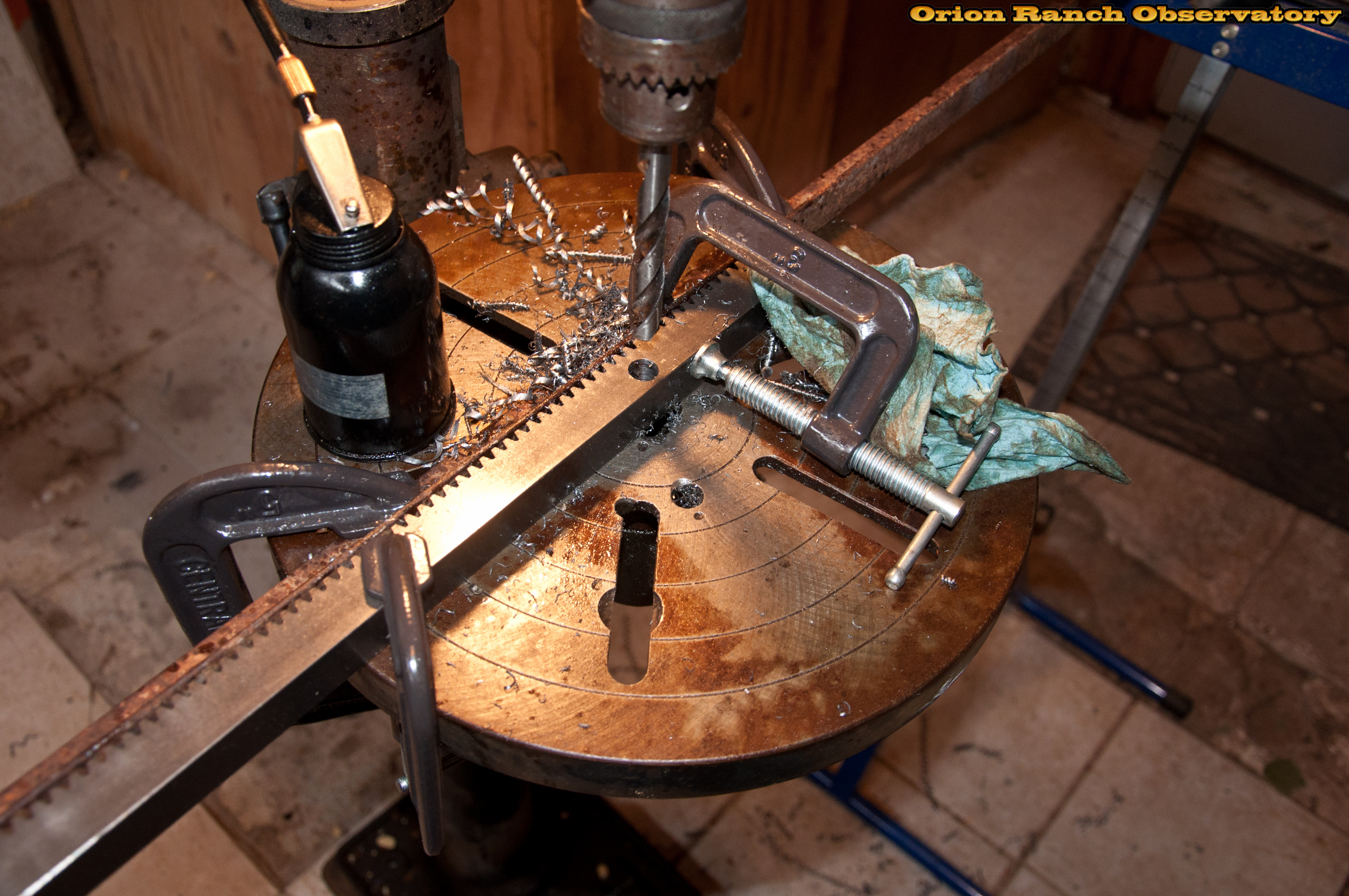 The drill press setup for drilling the holes in the racks.
