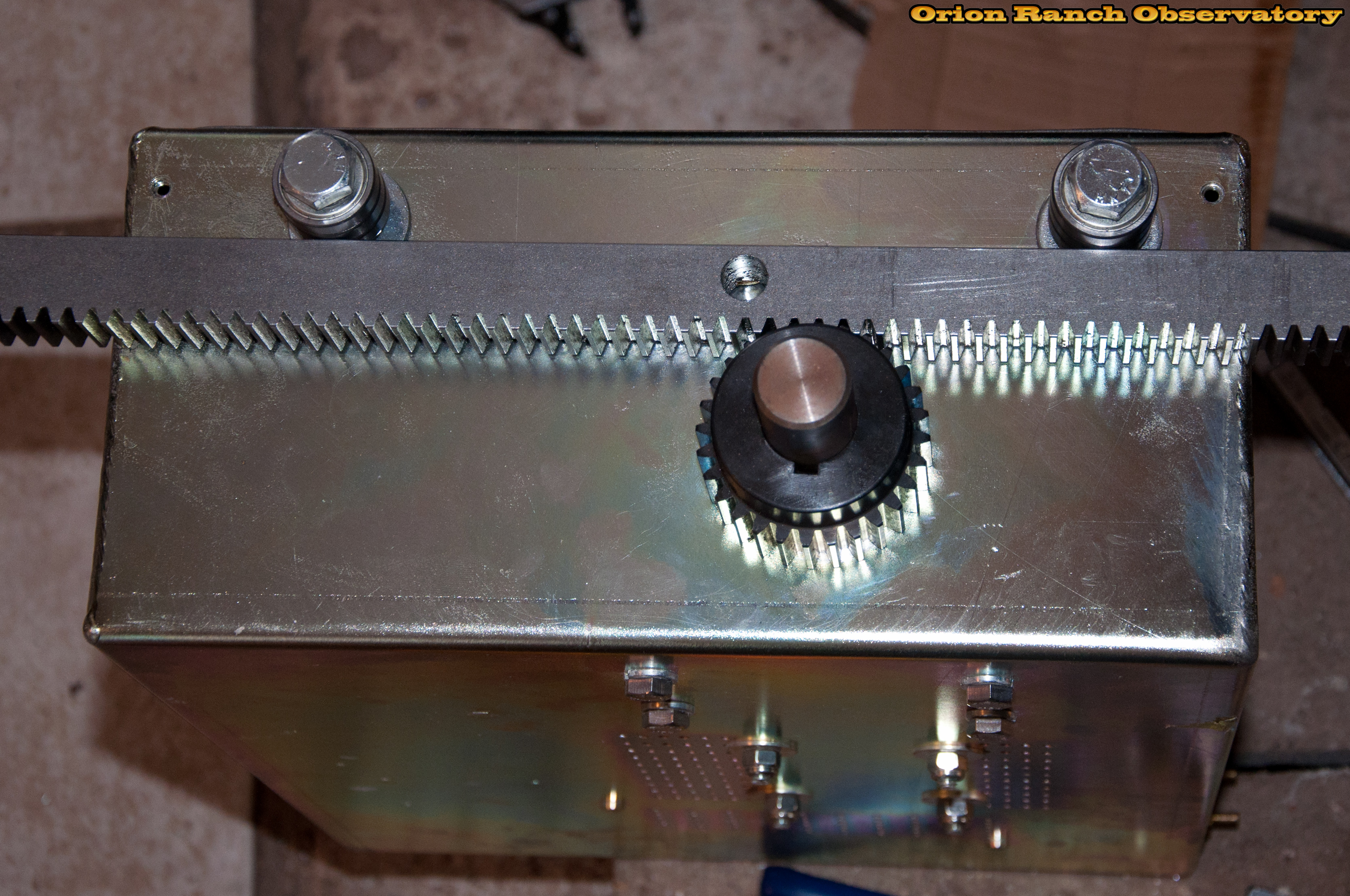 Mounting the capture bearings to get the spacing set. The rack will actualy ride further from the face of the motor box.