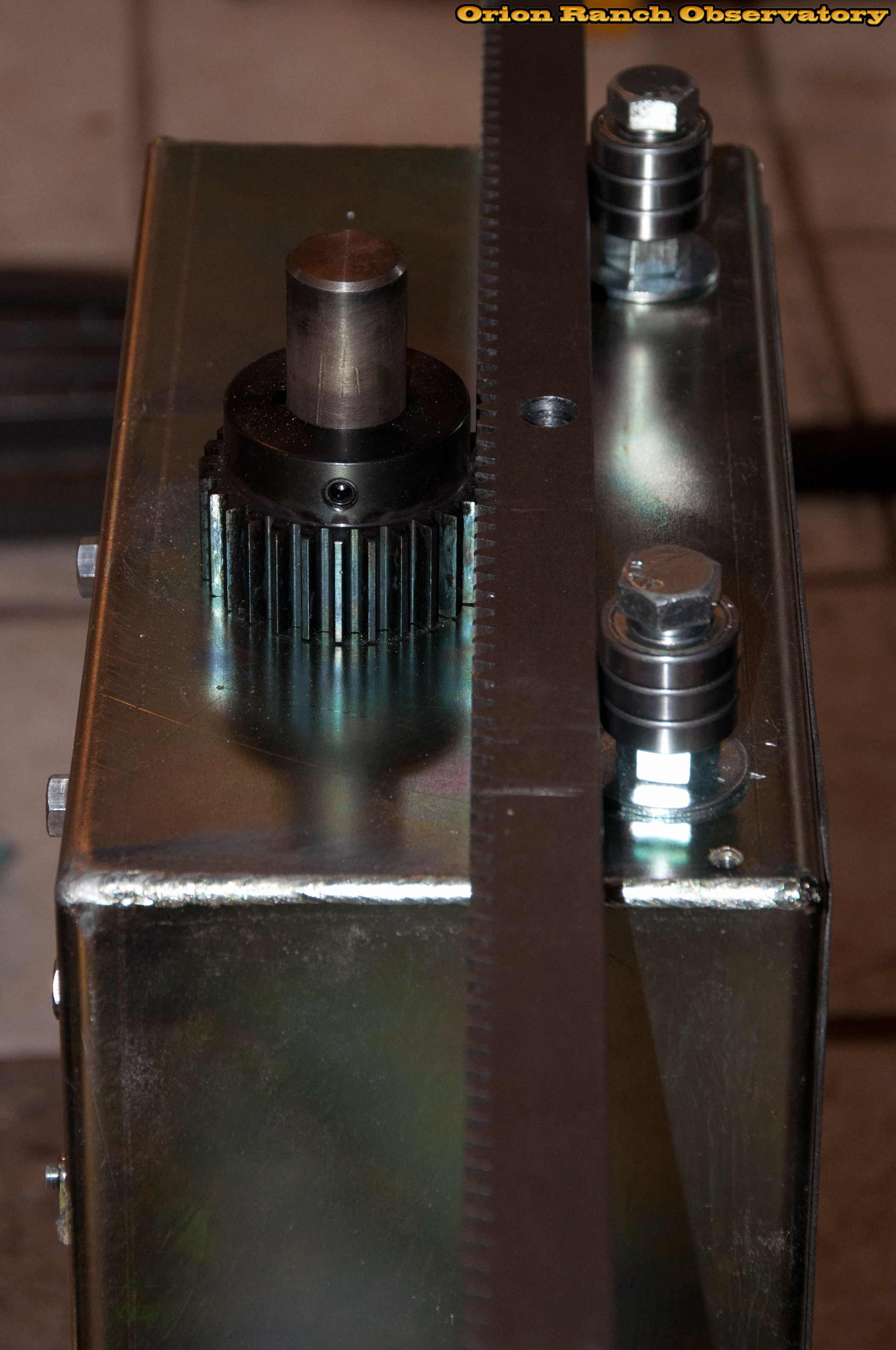 Mounting the capture bearings to get the spacing set. The rack will actualy ride further from the face of the motor box.