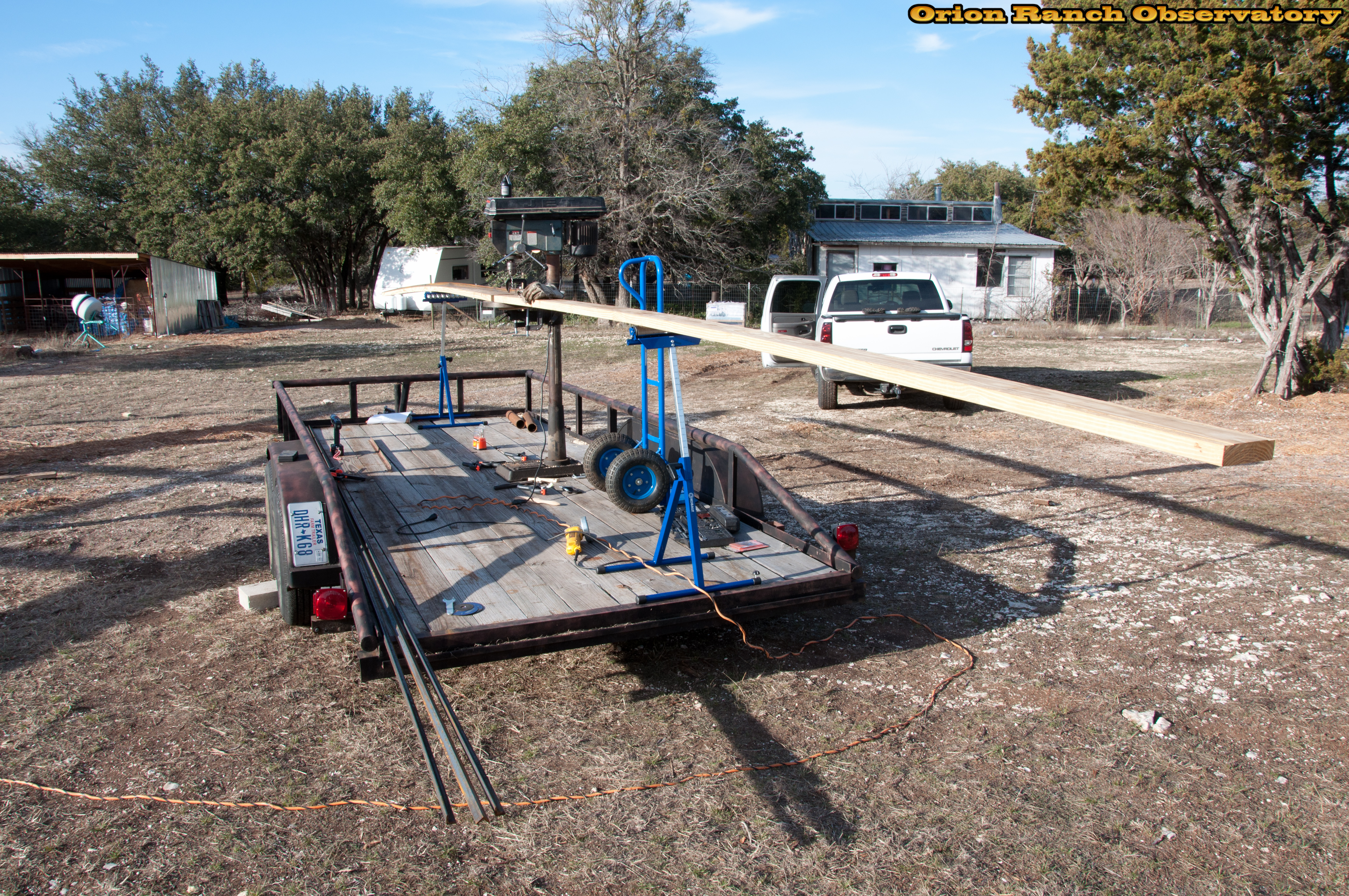 Drilling the angle iron for the roll-off rails.