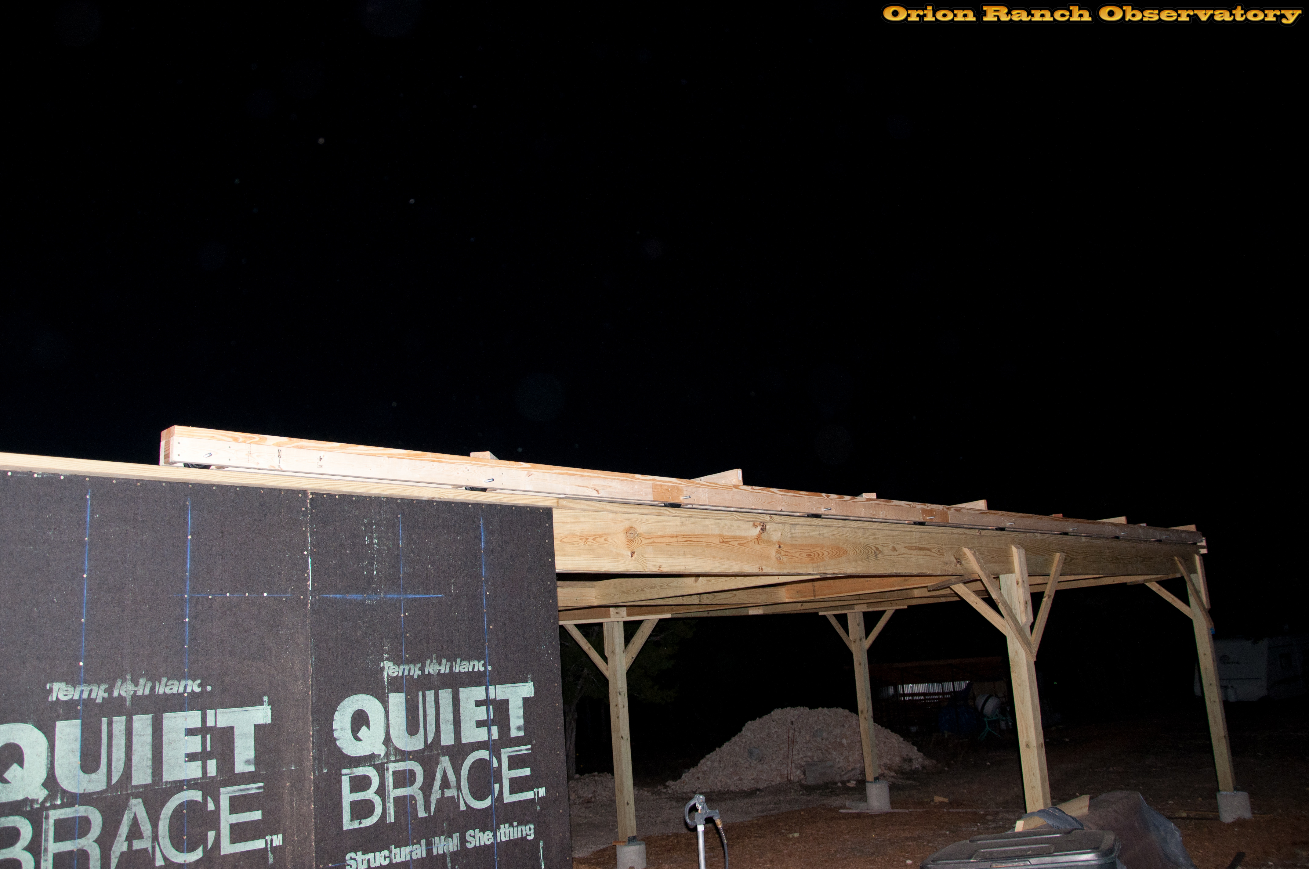 Roll-off side rails with temporary cross bracing shown in the maximum open position, which leaves about 5' of warm room roof exposed.