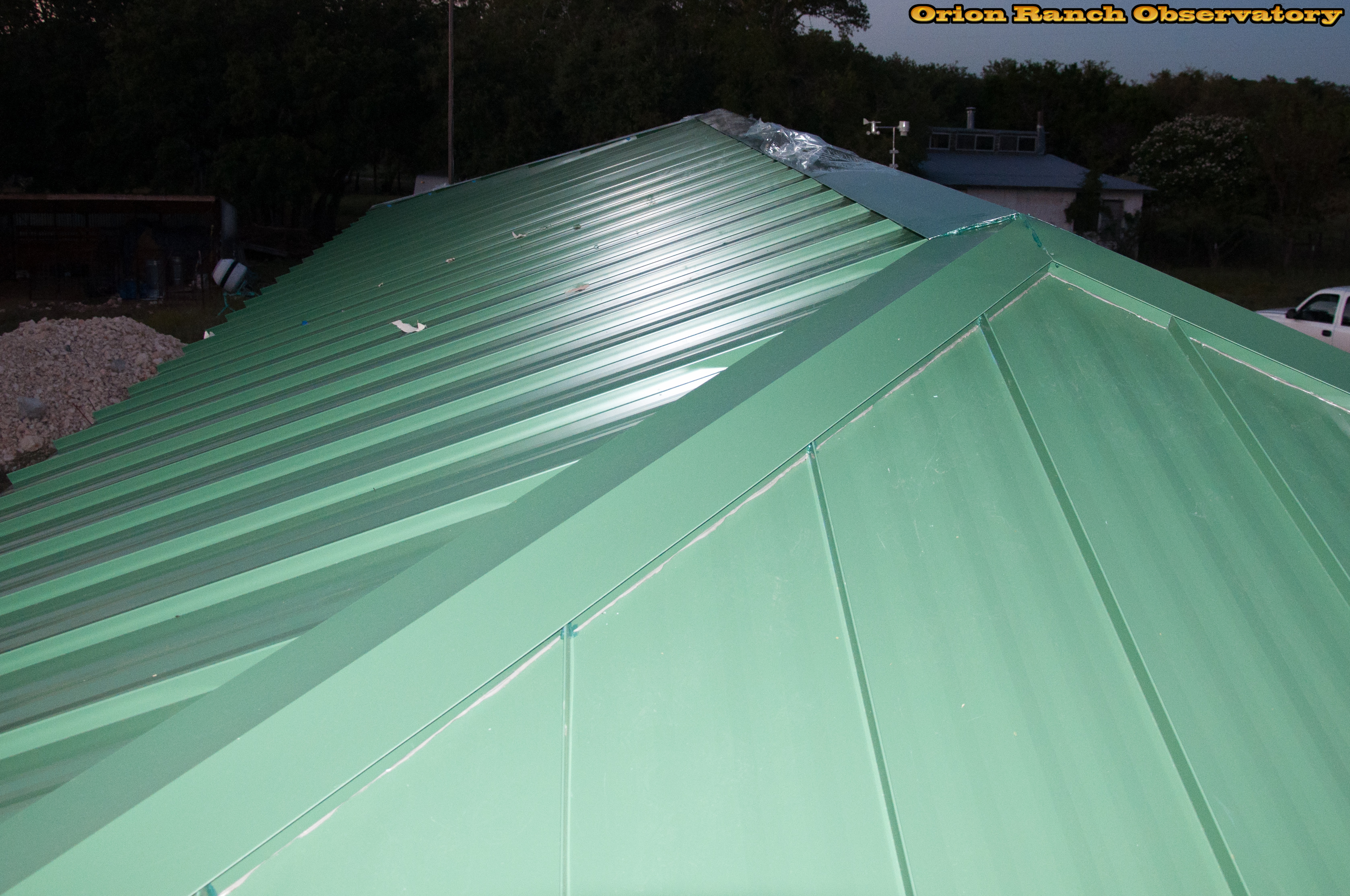 Finished snapping on the ridge caps (what a pain!) as the sun sets.