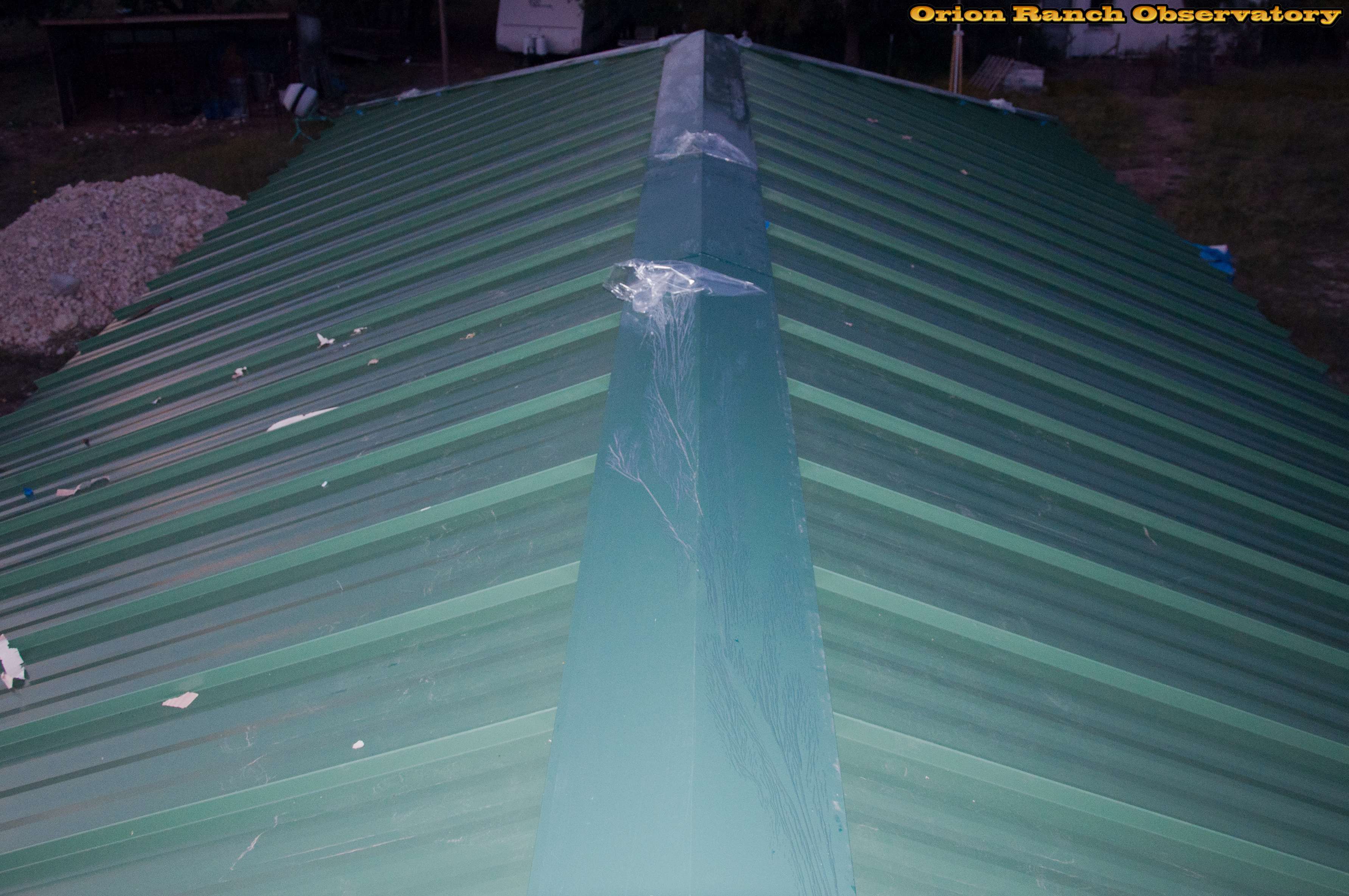 Finished snapping on the ridge caps (what a pain!) as the sun sets.