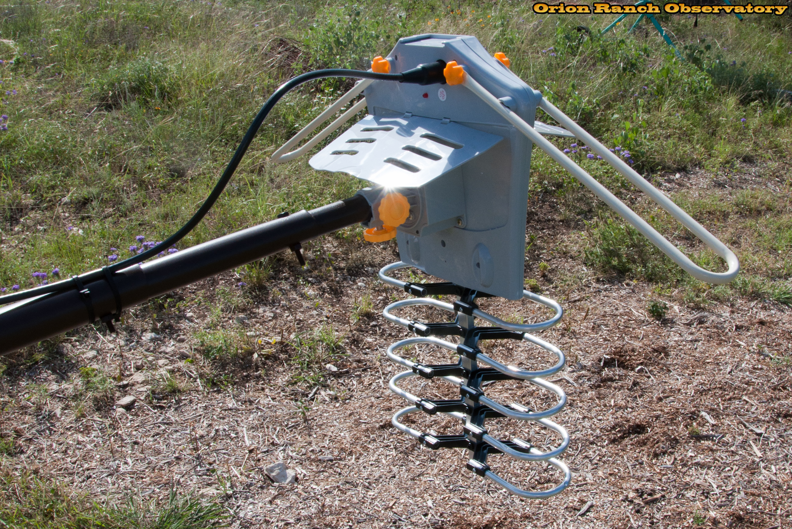 Detail of the attachment of the HDTV antenna. You can see the two orange knobs that clamp the rotor to the mast