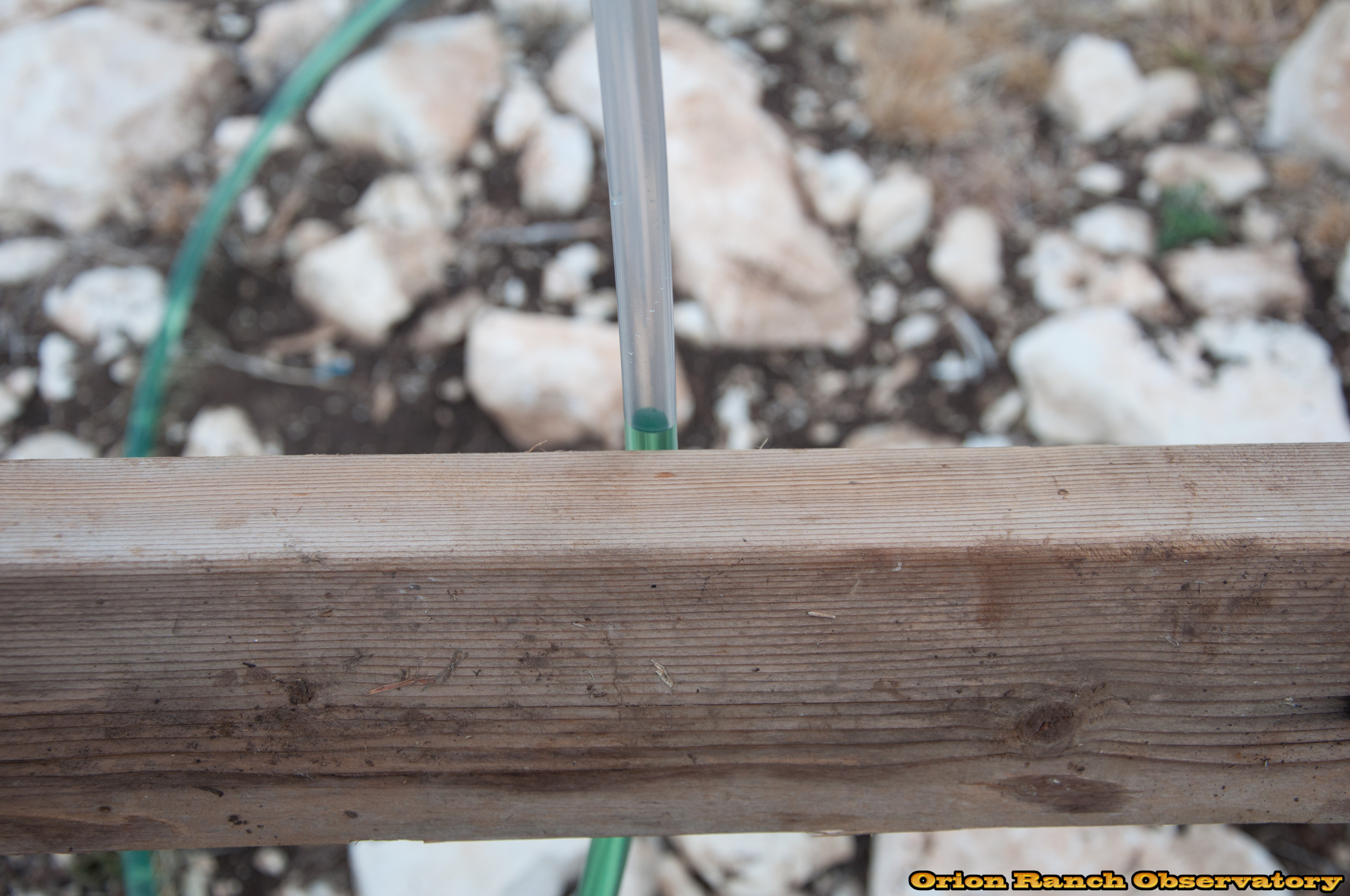 Using an old fashioned water level to make sure that everything is level. Works better than a laser level over this distance!