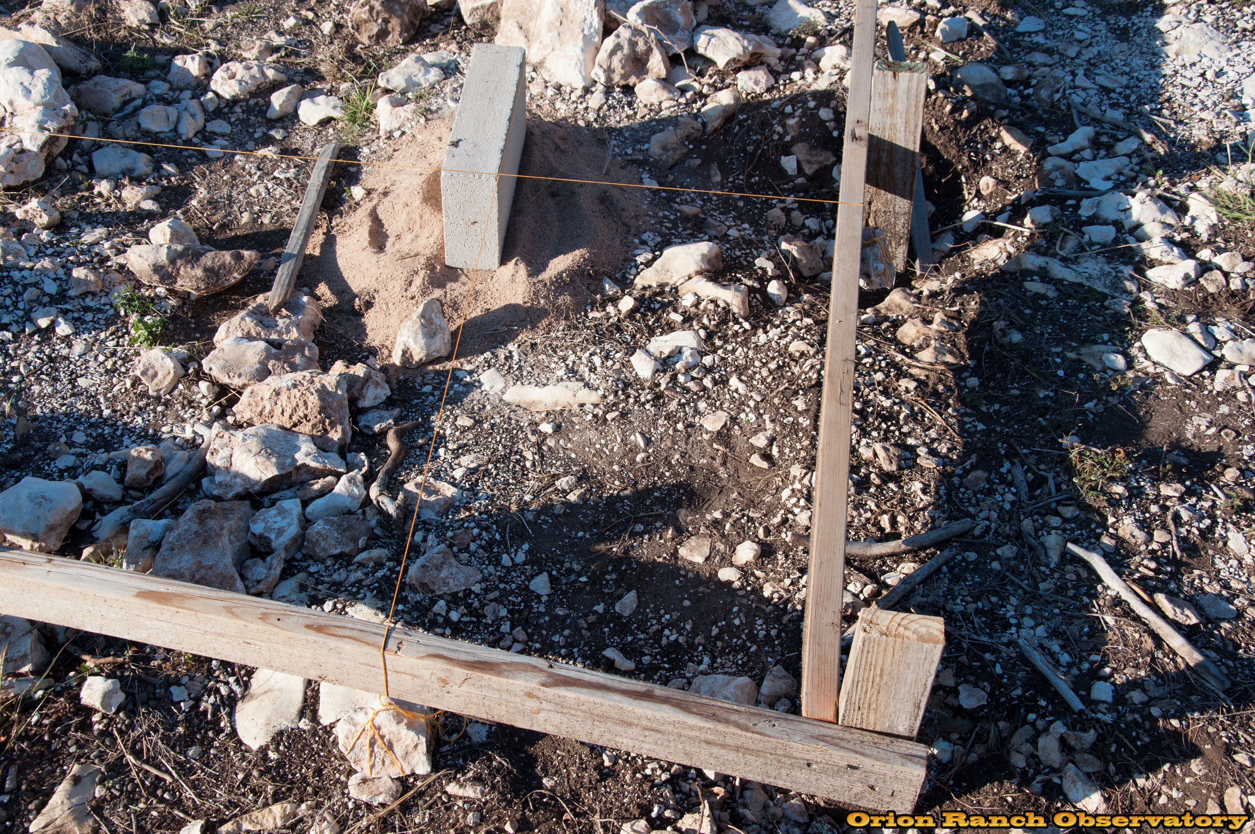 Stringing lines and squaring up boundary of foundation.