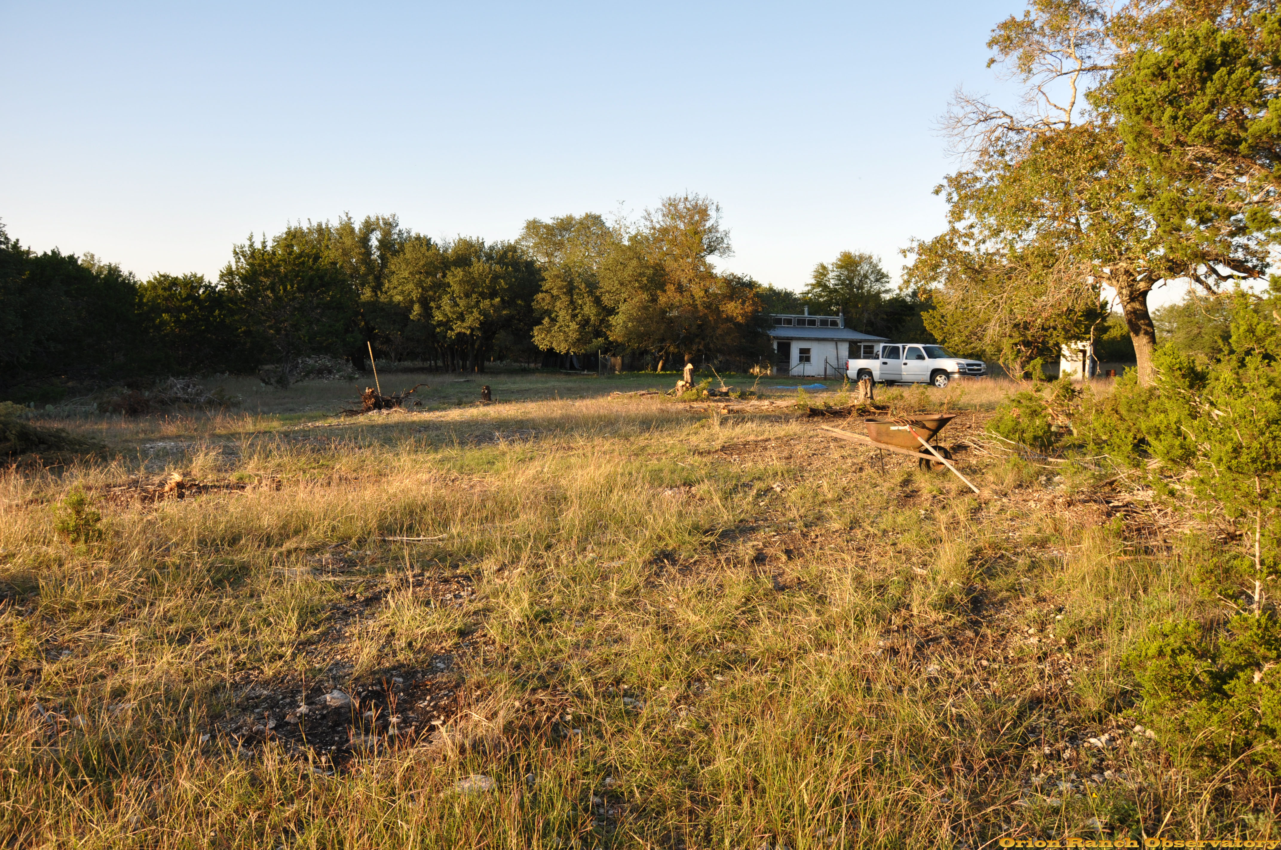 Looking northeast towards the construction site after clearing the cedars and cactus. You can see the old "house" (if you care to call it that) in the background. At least it's a place to store junk for now! October 30th, 2009.