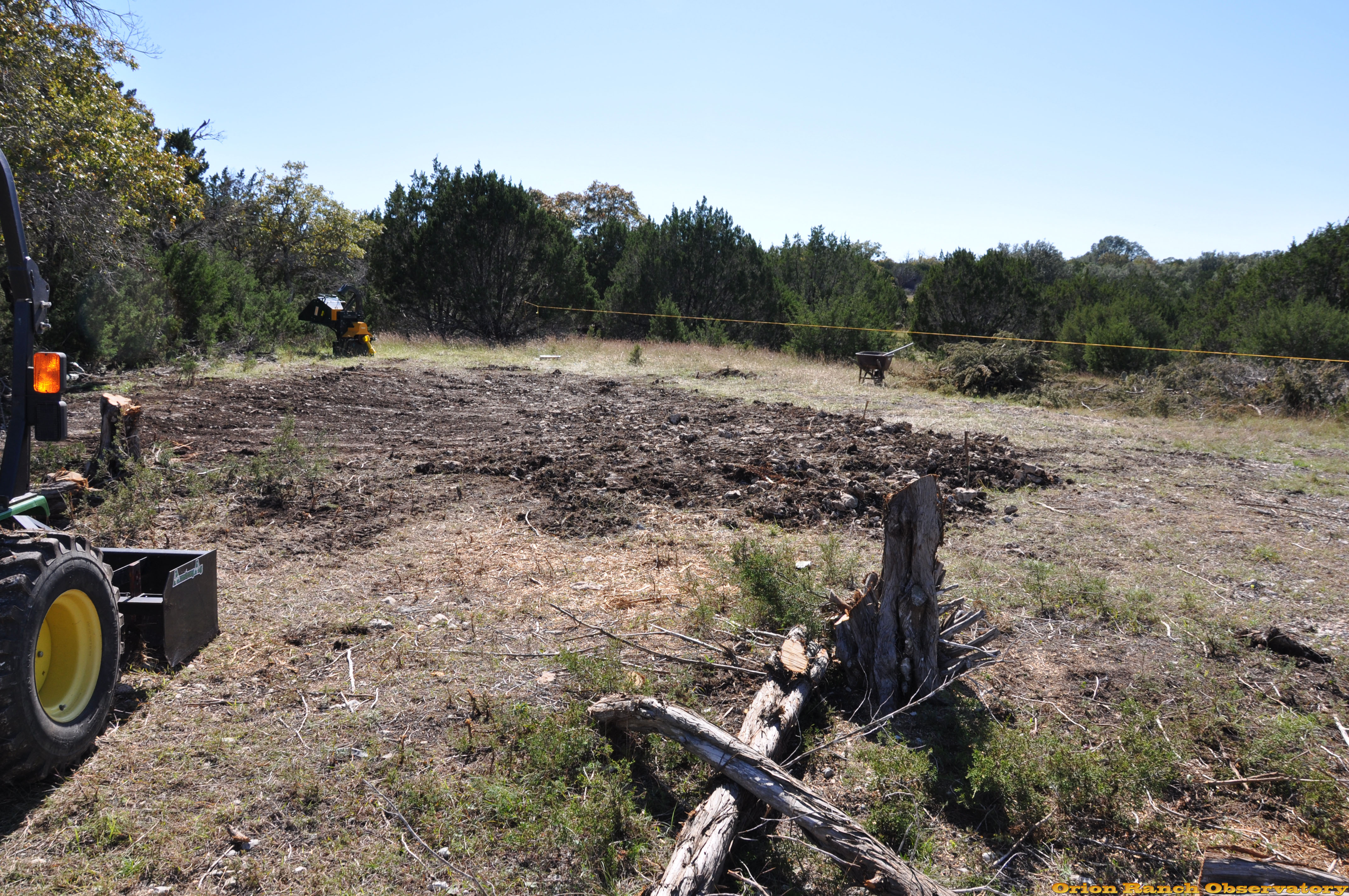 After a morning of work leveling the pad, I have a more-or-less flat area approaching the target size of the building. This is looking southwest towards the construction site. October 31st, 2009. Happy Halloween!