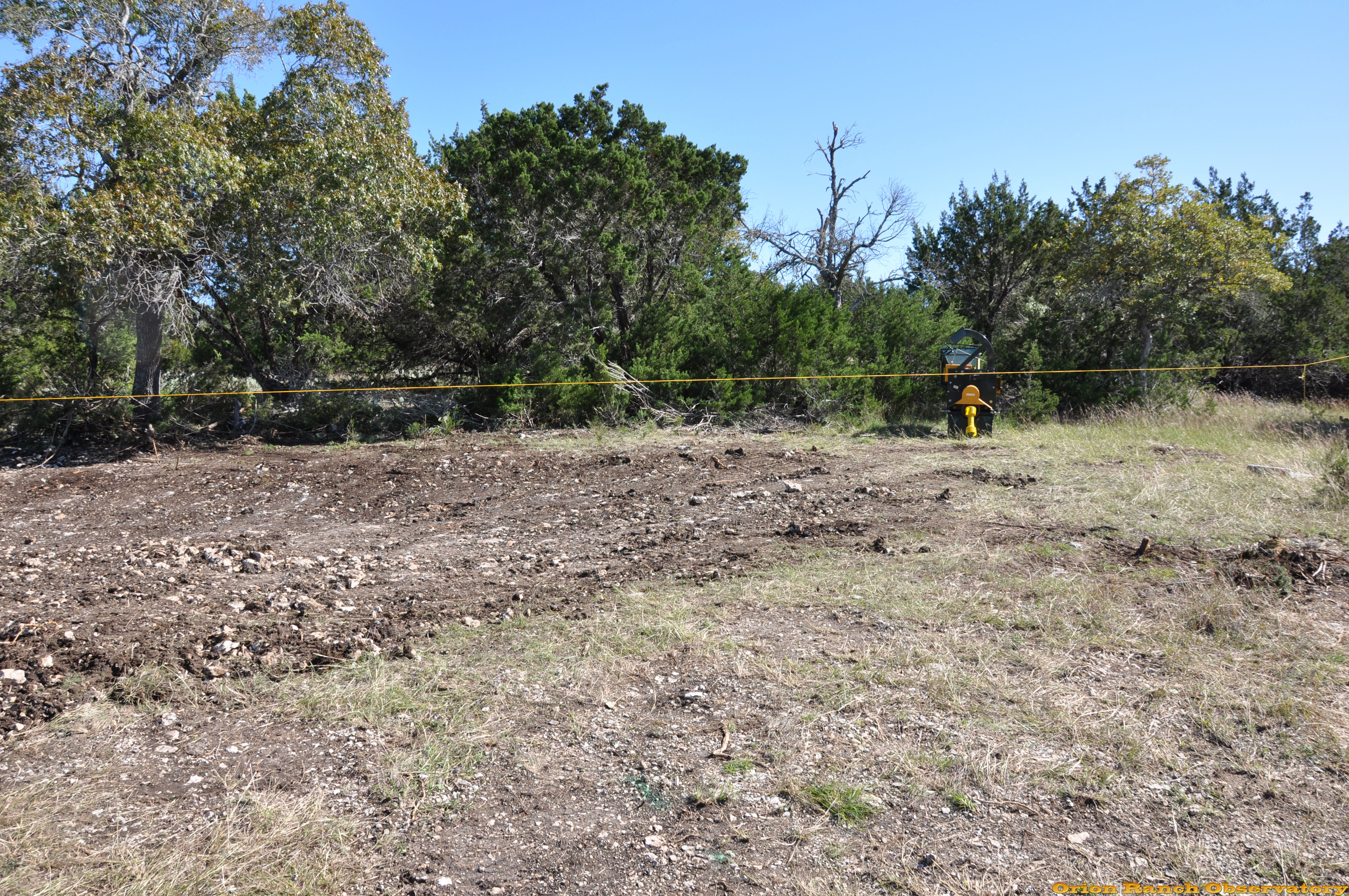 After a morning of work leveling the pad, I have a more-or-less flat area approaching the target size of the building. This is taken from just west of the pad, looking southeast. October 31st, 2009. Happy Halloween!